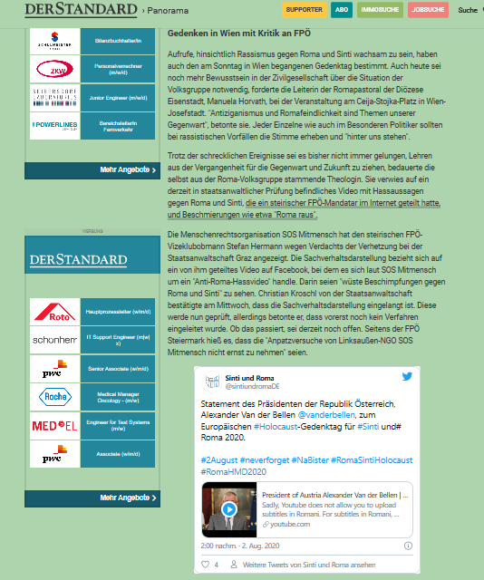 „Sie verwies auf ein derzeit in staatsanwaltlicher Prüfung befindliches Video mit Hassaussagen gegen Roma und Sinti, die ein steirischer FPÖ-Mandatar im Internet geteilt hatte, und Beschmierungen wie etwa ‚Roma raus‘. Die Menschenrechtsorganisation SOS Mitmensch hat den steirischen FPÖ-Vizeklubobmann Stefan Hermann wegen Verdachts der Verhetzung bei der Staatsanwaltschaft Graz angezeigt. Die Sachverhaltsdarstellung bezieht sich auf ein von ihm geteiltes Video auf Facebook, bei dem es sich laut SOS Mitmensch um ein „Anti-Roma-Hassvideo“ handle. Darin seien „wüste Beschimpfungen gegen Roma und Sinti“ zu sehen.“