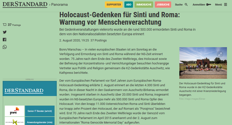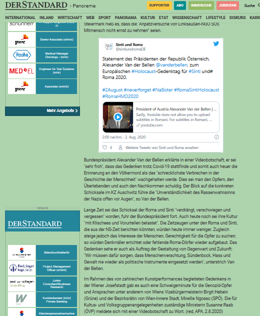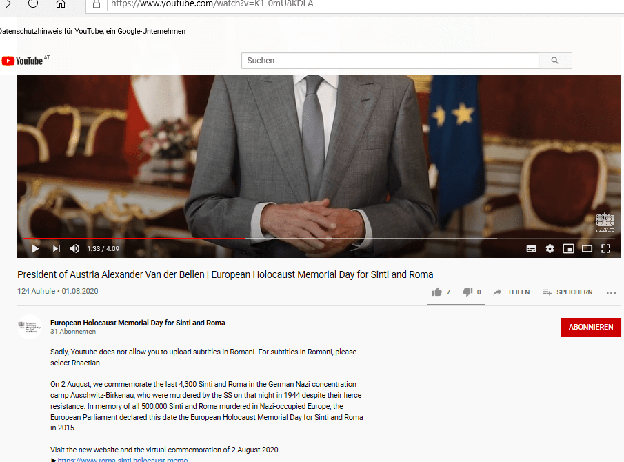 PS Wenn Sie einer oder eine von den 31 Abonnentinnen von „European Holocaust Memorial Day for Sinti and Roma“ sind, dann werden Sie die Videobotschaft des österreichischen Bundespräsidenten bereits kennen, wenn nicht, und Sie wollen diese Videobotschaft doch finden, dann klicken Sie auf diesen Link: https://www.youtube.com/watch?v=K1-0mU8KDLA …