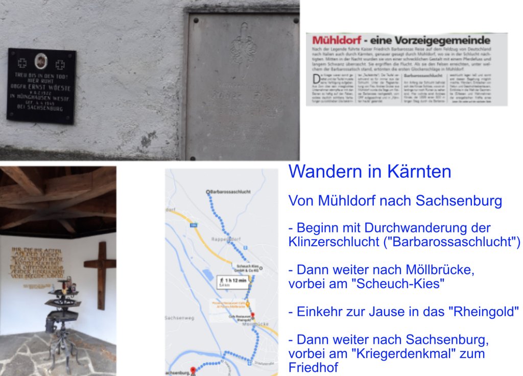 „Nach der Legende führte Kaiser Friedrich Barbarossas Reise auf dem Feldzug von Deutschland nach Italien auch durch Kärnten, genauer gesagt durch Mühldorf, wo sie in der Schlucht nächtigten. Mitten in der Nacht wurden sie von einer schrecklichen Gestalt mit einem Pferdefuss und langem Schwanz überrascht. Sie ergriffen die Flucht. Als sie den Felsen erreichten, unter welchem der Barbarossatisch stand, ertönten die ersten Glockenschläge in Mühldorf.“
