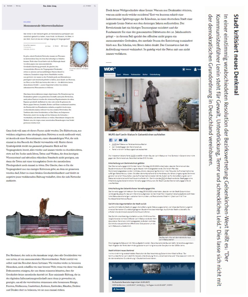 „Doch keine Weltgeschichte ohne Ironie. Warum nur Denkmäler stürzen, warum nicht auch welche errichten? Erst vor kurzem erhielt eine linksextreme Splittergruppe die Erlaubnis, in einer deutschen Stadt eine originale Lenin-Statue aus den dreissiger Jahren aufzustellen. Der Revolutionär hat ein blutiges Terrorregime errichtet und die Fundamente für eine der grausamsten Diktaturen des 20. Jahrhunderts gelegt – in diesem Fall spricht das offenbar nicht gegen ein monumentales Gedenken, der mediale Sturm der Entrüstung zumindest blieb aus. Ein Schelm, wer Böses dabei denkt. Das Coronavirus hat die Aufstellung vorerst verhindert. So gnädig wird die Natur mit uns nicht immer verfahren.“