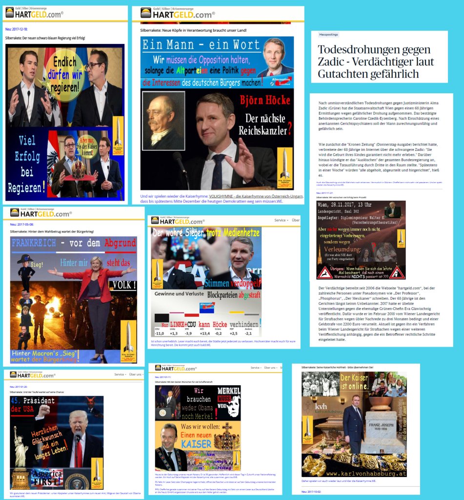 Weil es sich doch um eine recht besondere „höhergradige geistig seelische Abnormität“ zu handelt scheint, ablesbar beispielsweise daran, wem er zu Wahlerfolgen gratuliert. Im September 2019: „Wir beglückwünschen Hrn. Kurz zum Volksvotum für seine neue Aufgabe.“ Im Dezember 2017 der Zuruf an Herrn Kurz und Herrn Strache: „Viel Erfolg beim Regieren!“ Im Jänner 2017: „Wir gratulieren dem neuen Präsidenten [Donald Trump].“ Und immer wieder, immer wieder der Wunsch, die Sehnsucht nach einem „Kaiser“, der für ihn Karl Habsburg sein soll, dem er auch zum Geburtstag gratuliert. Und der „Reichskanzler“ sollte ein Mann sein, von dem in Österreich nicht nur der 68-Jährige angetan …