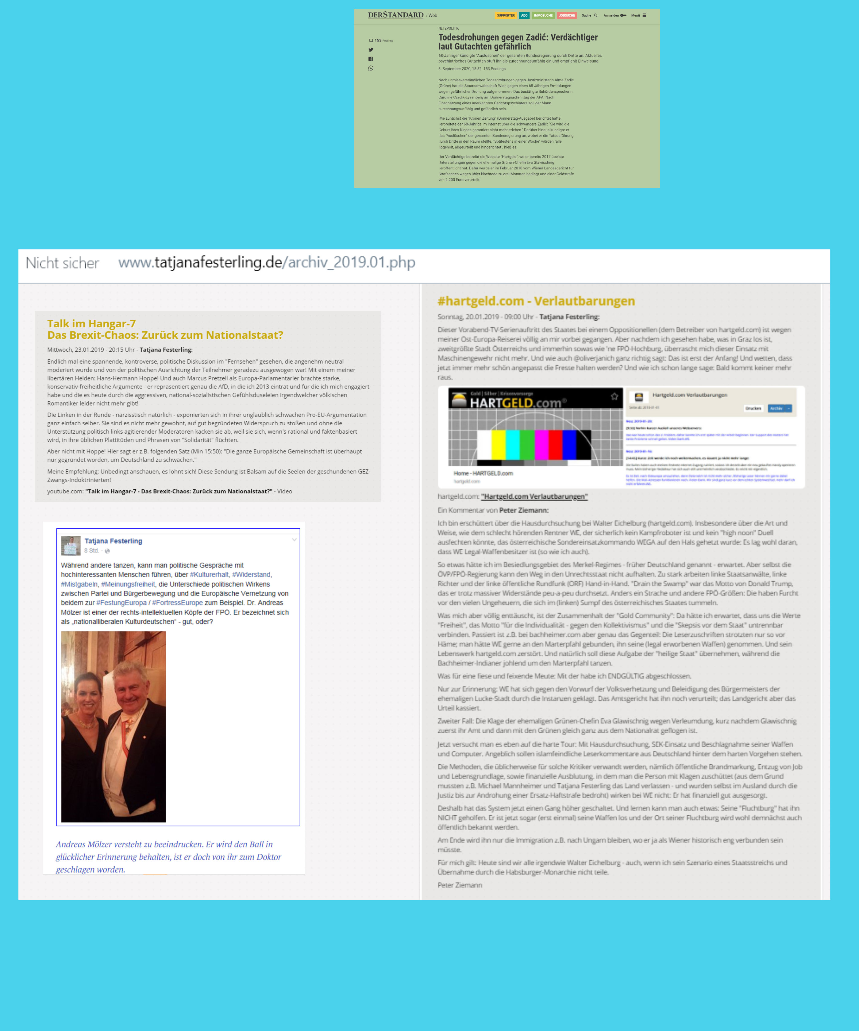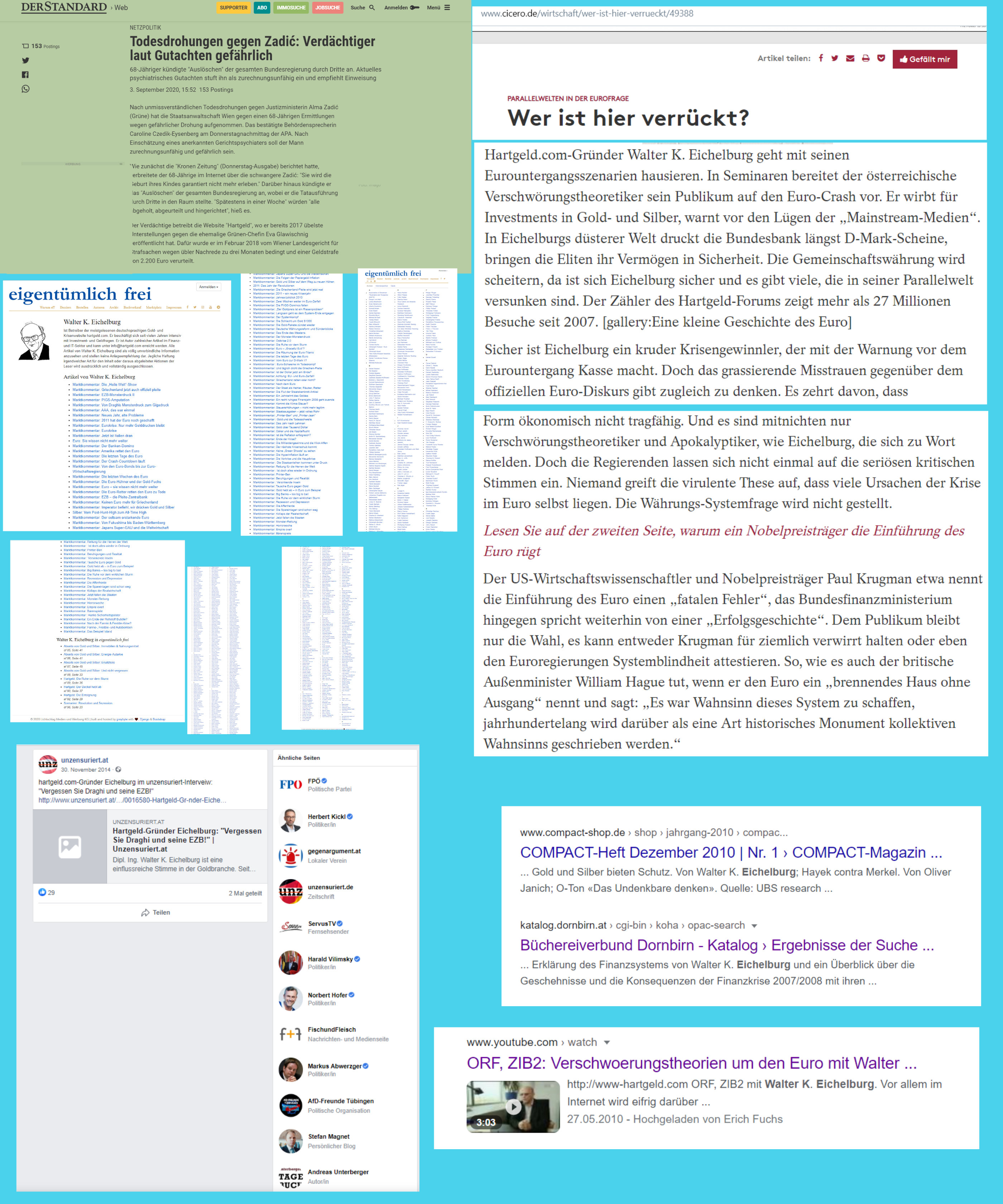 Zur geistigen Nahrung, die er zu bevorzugen scheint, da er sie selbst empfiehlt, gehören einige der sogenannten Edelfedern des österreichischen Journalismus, die für eine recht besondere Website …, österreichgemäß ein ehemaliger Chefredakteur von „Die Presse“ und „Wiener Zeitung“, selbstverständlich die zensurierte Website der für kurz gewesenen Regierungspartei, natürlich der alte Waffenmann, der für Kurzens Regierung mit Strache in Österreich etliche Paragraphen schrieb …