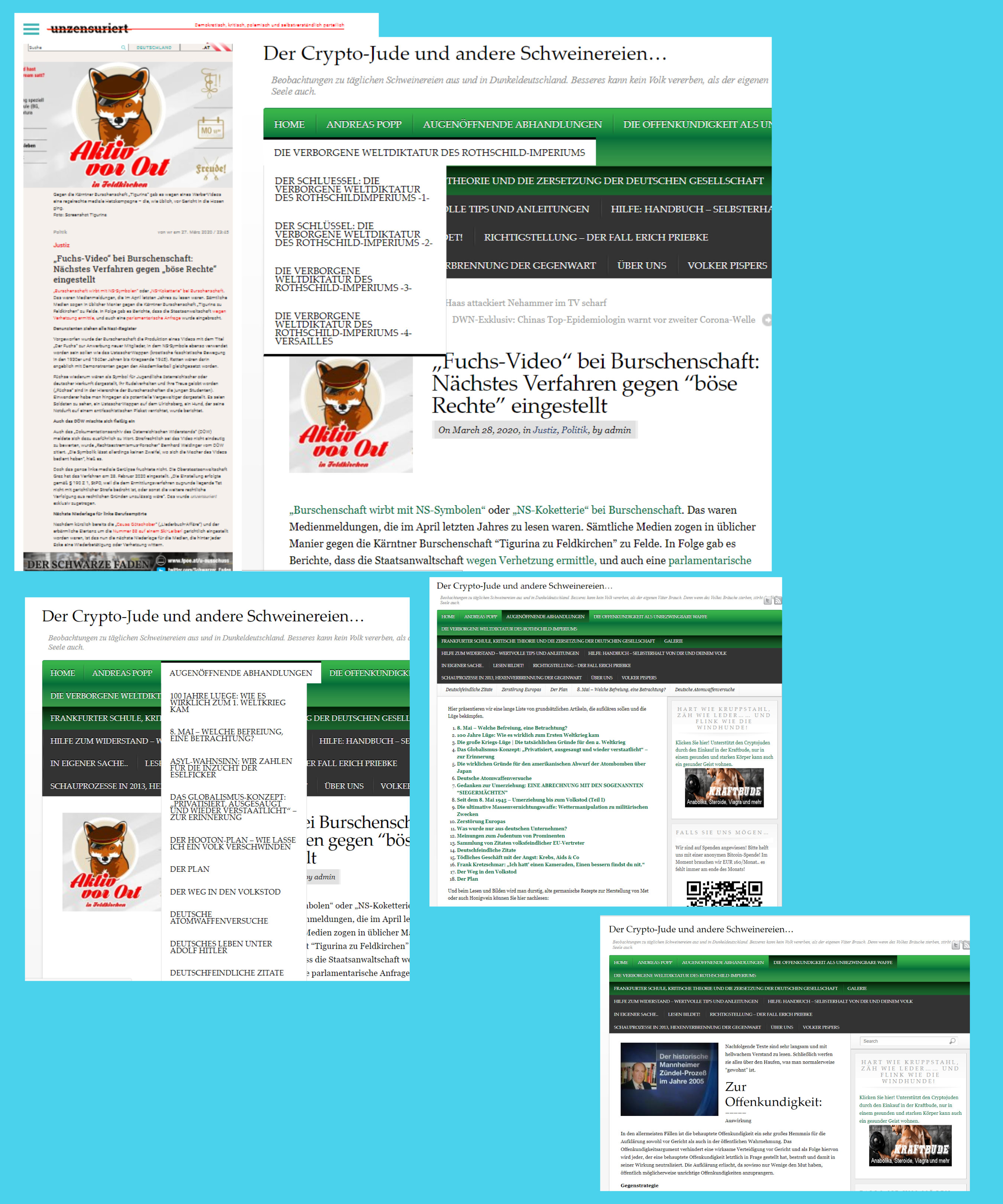 „Der Cryptojude“, so der junge Begleiter des älteren Herrn, verdiene nach seinem Ermessen und auch nach dem Ermessen seines väterlichen Freundes die größte Aufmerksamkeit, nicht nur daß er Kommentare von der recht geachteten Unzensuriert übernehme, wie den über die Einstellung gegen die „Burschenschaft in Feldkirchen“, dem „Crypto-Juden“ falle auch das Verdienst zu, aufzuklären, etwa über die „verborgene Weltdiktatur des Rothschild-Imperiums„, über den „Hooton-Plan“, „deutsches Leben unter Adolf Hitler“, die „tatsächlichen Gründe für den 2. Weltkrieg“, „Nürnberg 2.0“, „seit dem 8. Mai 1945 – Umerziehung bis zum Volkstod“, „alles über Juden“ — „augenöffnende Abhandlungen“ seien das, einfach wie kurz gesagt …