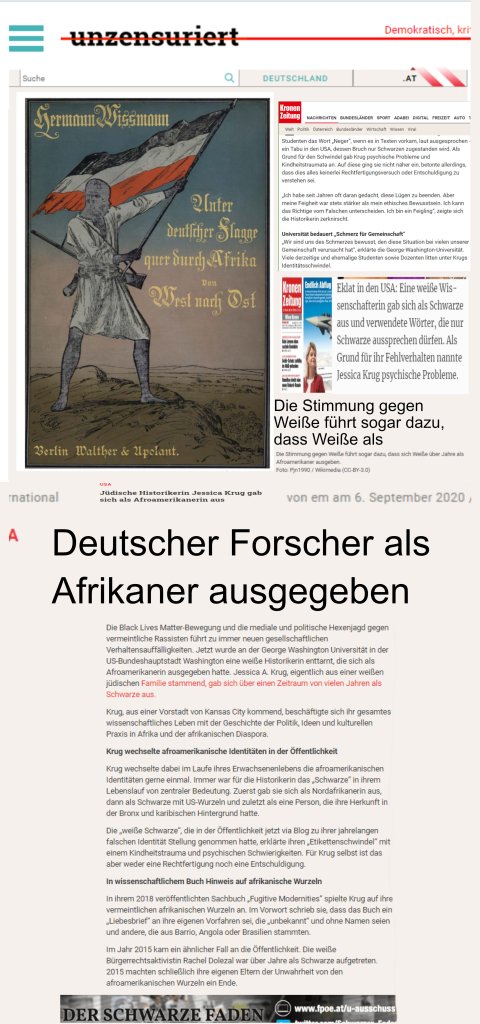 Aber Österreich ist als Land doch viel zu klein, für viele, viele Identitäten, kaum, daß es für eine Identität in diesem Land Platz gibt, eine zweite schon muß in die eine erste kaum Platz habende eingesprenkelt … so wird die zensurierte Website der für kurz gewesenen Regierungspartei mit ihrer Annahme, daß die Stimmung gegen Weiße sogar dazu führe, also auch in Österreich, daß Deutsche über ein Jahrhundert als Afrikaner ausgegeben werden müssen, wie beispielsweise der arme weißdeutsche Forscher …