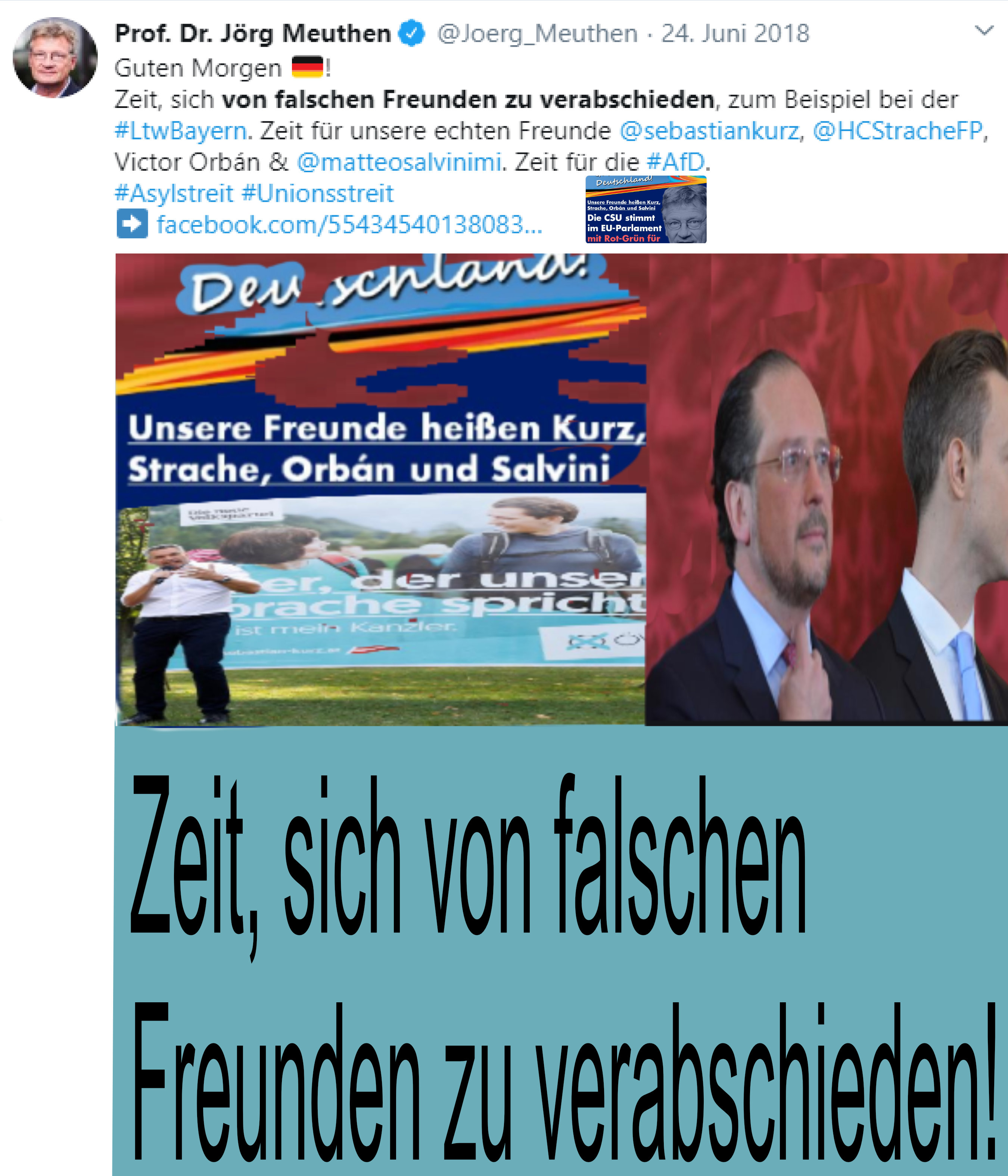 Kurz, aber klar von Jörg Meuthen auf den Punkt gebracht: „Zeit, sich von falschen Freunden zu verabschieden, zum Beispiel“ von seinen „echten Freunden“, die ihm „heißen Kurz, Strache, Orbán, Salvini“ …