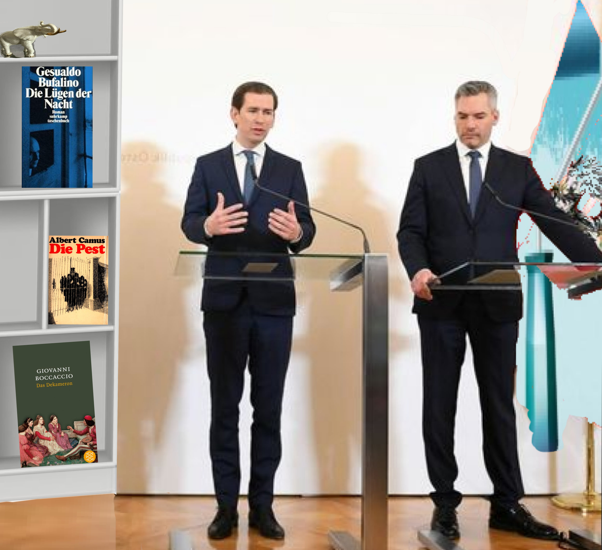 Aber es ist nicht die Regierung allein, die meint, mit dem Verdonnern zum absoluten Gehorsam, mit dem Befehl zum totalen Gleichschritt ein medizinisches Problem lösen zu können, während es andere Wege gäbe, ein medizinisches Problem zu lösen, gäbe es Demokratie und Zivilisation tatsächlich in diesem vollen Ausmaß, wie auch von dieser Regierung behauptet und spätestens jetzt, seit es losging, mit dem Coronavirus, permanent selbst widerlegt, durch ihr reflexartiges Heranziehen von Mitteln, die für den Zweck, ein medizinisches Problem zu lösen, je länger dieses medizinische Problem dauert, ungenügend sind, ständig von ihr selbst widerlegt wird, durch ihren reflexartigen Einsatz von Mitteln, die einer demokratischen Zivilisation absolut nicht entsprechen; es ist nicht die Regierung allein, die sich dem Rausch des Befehlens hingibt, sondern auch zu viele, die ihren Befehlen folgen, als wären sie auf sie vereidigt, als hätten sie ihr den Schwur absoluten Gehorsams geleistet und gleich Vorzugsschulkindern leisten sie darüber hinaus mehr noch als ihnen befohlen, durch freiwillige Aktivitäten, die der Befehlshaberin Regierung dienlich, nützlich zum Einhalten der Regierungsdekrete und Ruhighalten der Menschen. Dafür wird alles in die Schlacht geworfen, was je nur in die Schlacht geworfen werden kann, unbrauchbar zwar zum Lösen eines medizinischen Problems, aber hochwillkommen als Schalmeienmarschtakte, Menschen leichter in den Gleichschritt zu bringen, auch die Literatur wird dafür in die Schlacht geworfen. Kaum ging es mit dem Coronavirus los, wurde sogleich prominent „Das Dekameron“ in Stellung gebracht, mit dessen Botschaft, sich zurückzuziehen, zu warten, die Zeit regierungsergeben sich zu vertreiben, mit erzählten Geschichten brav sich still zu beschäftigen, ruhig zu bleiben, das verordnete Schicksal dankbar hinzunehmen, sich nicht zu erheben, die „eigenen vier Wände“ nicht zu verlassen, nicht einmal an ein Aufbegehren zu denken zu wagen, zu vergessen, je etwas von demokratischer Zivilisation gehört zu haben, und zurückzukehren, geordnet, wenn es denn wieder erlaubt wird …