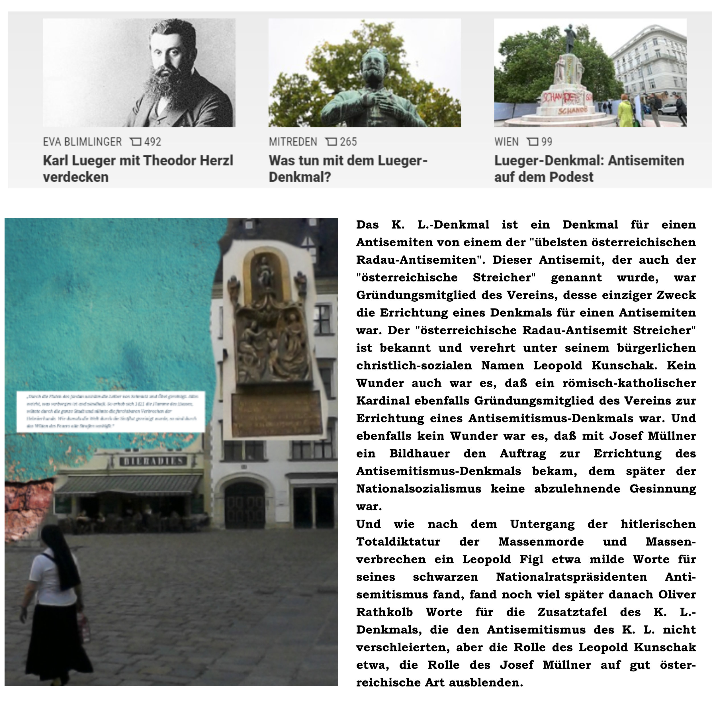 Das K. L.-Denkmal ist ein Denkmal für einen Antisemiten von einem der „übelsten österreichischen Radau-Antisemiten“. Dieser Antisemit, der auch der „österreichische Streicher“ genannt wurde, war Gründungsmitglied des Vereins, desse einziger Zweck die Errichtung eines Denkmals für einen Antisemiten war. Der „österreichische Radau-Antisemit Streicher“ ist bekannt und verehrt unter seinem christlich-sozialen bürgerlichen Namen Leopold Kunschak. Kein Wunder auch war es, daß ein römisch-katholischer Kardinal ebenfalls Gründungsmitglied des Vereins zur Errichtung eines Antisemitismus-Denkmals war. Und ebenfalls kein Wunder war es, daß mit Josef Müllner ein Bildhauer den Auftrag zur Errichtung des Antisemitismus-Denkmals bekam, dem später der Nationalsozialismus keine abzulehnende Gesinnung war. Und wie nach dem Untergang der hitlerischen Totaldiktatur der Massenmorde und Massenverbrechen ein Leopold Figl etwa milde Worte für seines schwarzen Nationalratspräsidenten Antisemitismus fand, fand noch viel später danach Oliver Rathkolb Worte für die Zusatztafel des K. L.-Denkmals, die den Antisemitismus des K. L. nicht verschleierten, aber die Rolle des Leopold Kunschak etwa, die Rolle des Josef Müllner auf gut österreichische Art ausblenden.
