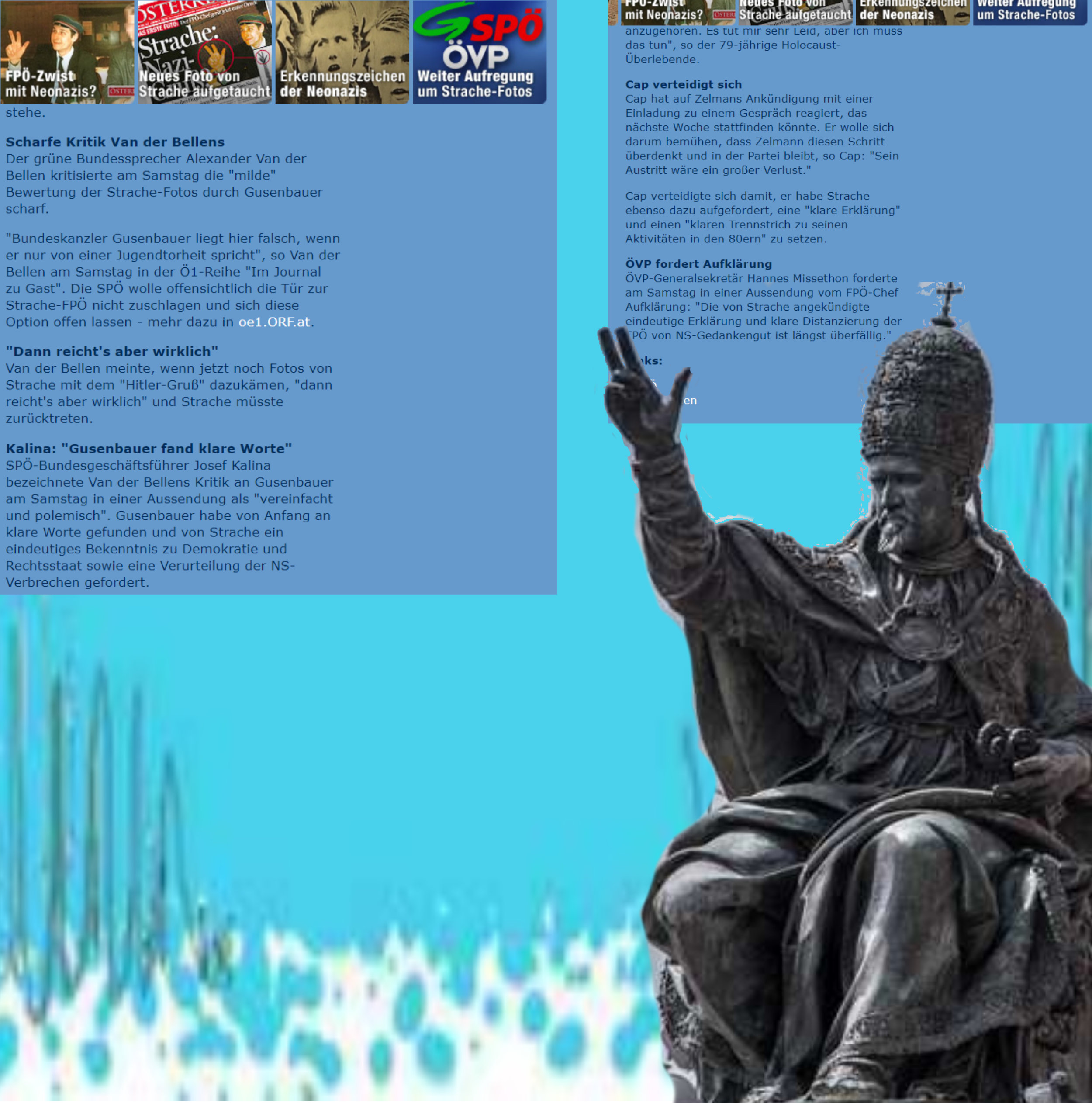 Dieses Handzeichen ist nun kein Thema mehr. Verursacht keine Aufregung mehr. So geschichtlich bewandert wie die Mannen und Frauen der identitären Parlamentspartei sind, hat die Erklärung des für kurz gewesenen Vizekanzlers, vielleicht habe er mit seinen gespreizten drei Fingern Bier bestellen wollen, doch verwundert, er hätte auch sagen können, er wollte nur einen fernen Gruß an den Papst in Rimini schicken, wo seit vierhundert Jahren eine Statue eines Papstes steht, der mit drei Fingern …
