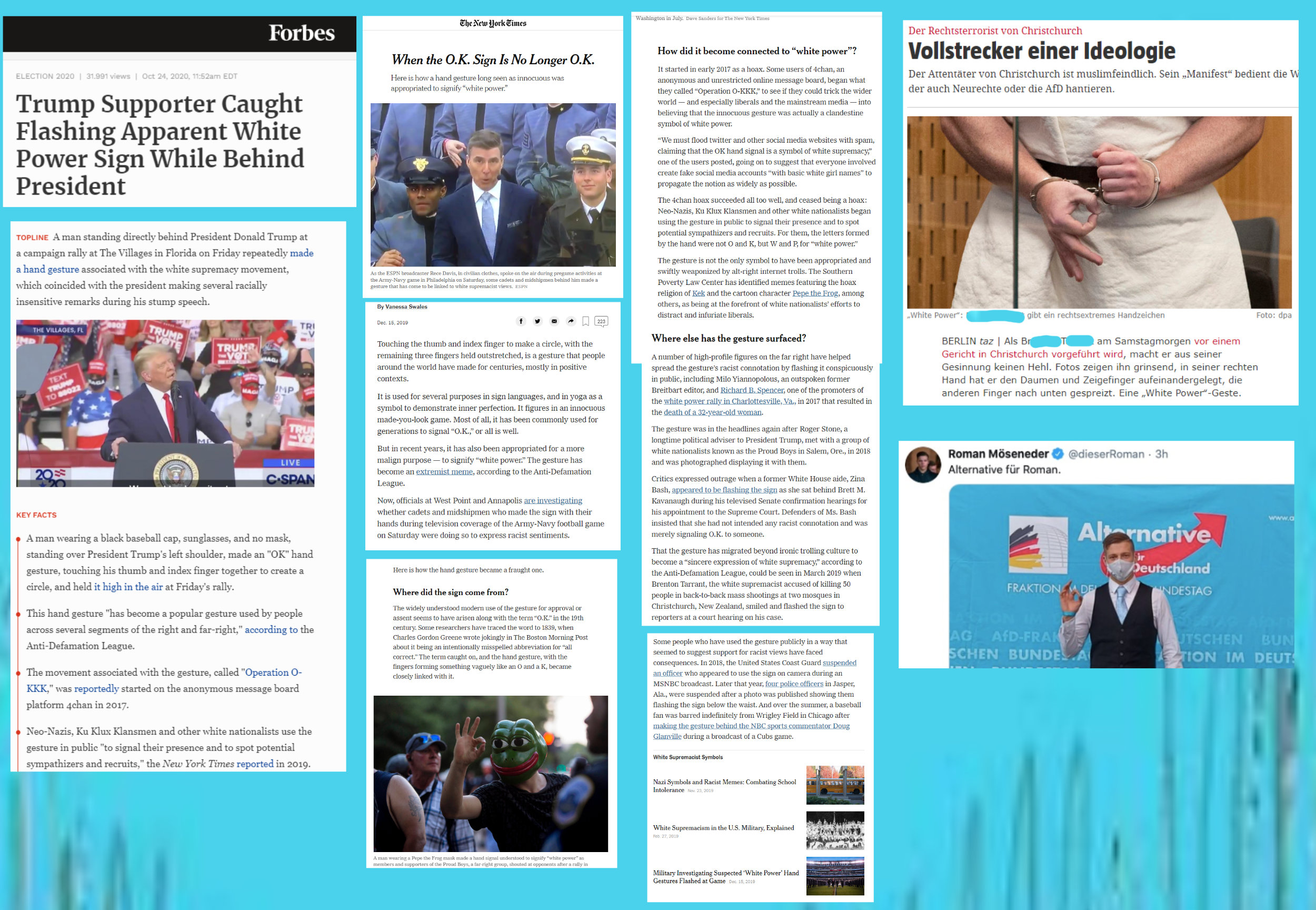 Was für ein falsches Zeichen, was für eine falsche Geste haben sich nun jene für sich ausgesucht, um ihre white power zu demonstrieren, wie, exemplarisch genannt, der Mörder in Christchurch, trumps proud boys und viele weitere … Ist doch alles, was sie mit dem von ihnen gestohlenen und mißbrauchten Handzeichen ausdrücken: Nichts ist in Ordnung, nichts ist gut, nichts ist friedlich, nichts ist harmonisch, keine Weisheit. Einzig das Intuitive rechtfertigte noch ihr Verwenden dieses Handzeichens in seinen ursprünglichen Bedeutungen, wenngleich auch das sehr eingeschränkt. Was sie tun, tun sie intuitiv, das heißt, alles von ihnen basiert auf Vermutungen. Von der ursprünglichen Bedeutung dieses Wortes im Lateinischen ist aber bei ihnen nichts vorhanden: Beurteilung. Sie sind instinktiv, das für sie passendere Wort, gelenkt. Das heißt. Alles, was sie tun, tun sie ohne zu überlegen, ohne zu überlegen lassen sie sich in jedweder Situation in ein falsches Tun führen.
