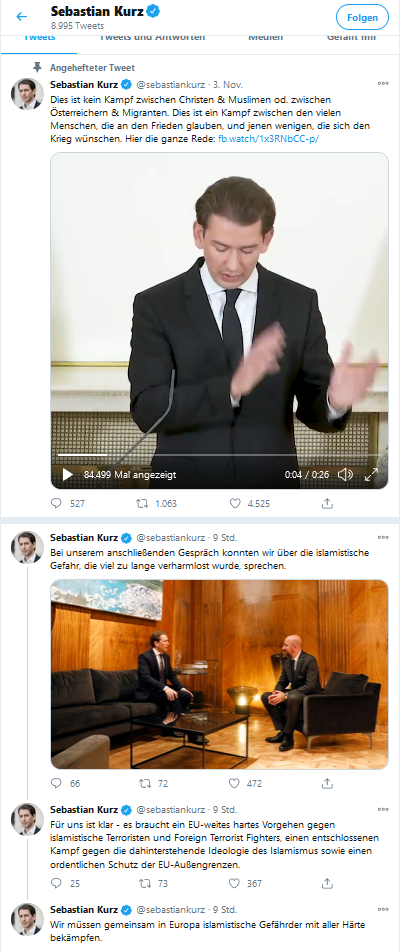 „Es muß uns allen bewußt sein, daß das keine Auseinandersetzung zwischen Christen und Muslimen oder zwischen Österreichern und Migranten ist. Nein. Das ist ein Kampf zwischen den vielen Menschen, die an den Frieden glauben, und jenen wenigen, die sich den Krieg wünschen. Es ist ein Kampf zwischen Zivilisation und Barbarei. Und diesen Kampf werden wir mit aller Entschlossenheit führen.“