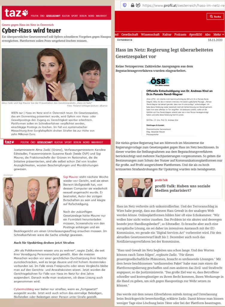 „Ein guter Tag beginnt mit einer Regierungsvorlage gegen Hass im Netz“, sagte […] Ihr sei ein „ordentliches Begutachtungsverfahren“ wichtig gewesen, und nach diesem habe man nun das Feintuning vorgenommen. Hass im Netz verbreite sich unkontrollierbar. Und der Terroranschlag in Wien habe gezeigt, dass aus diesem Hass Gewalt in der analogen Welt werden könne. Onlineplattformen bilden hier oft eine Echokammer. „Wir wollen hier nicht weiter zusehen. Das Problem ist ein akutes und deswegen besteht jetzt Handlungsbedarf“, so […]. „Hass und Gewalt im Netz begleiten uns schon lange. Und den Worten können rasch Taten folgen“, ergänzte […]“