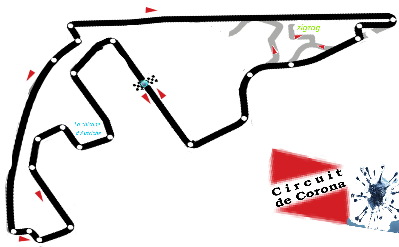 Auf einer Pandemie-Rennstrecke Cirquit de Covid-19 würde Österreich wohl die Ehre zuteil werden, daß ein Streckenabschnitt nach Österreich benannt werden würde: La chicane d’Autriche … vielleicht sogar zusätzlich eine Kurvenfolge: Séquence de courbes – Vert sur ligne de turqoise en zigzag – eine zwar ehrenwerte Benennung, aber eine viel zu lange, die wohl rasch einfach wie kurz auf zigzag …