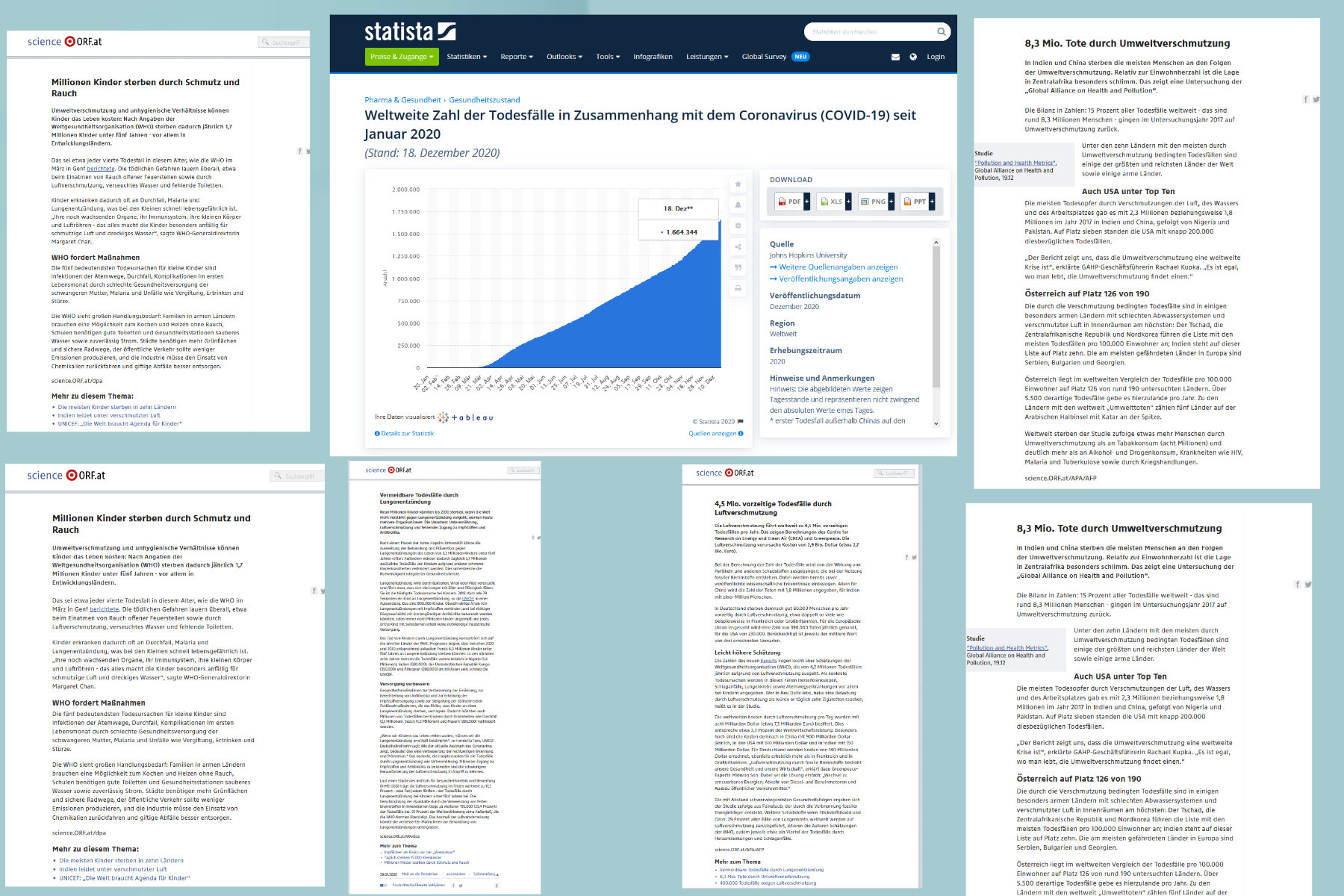 Von März ’20 bis zum 18. Dezember ’20 gibt es, wird berichtet, weltweit 1.664.344 Todesfälle im Zusammenhang mit dem Coronavirus (Covid-19). Wenn dem allein die Todesfälle durch Luftverschmutzung gegenübergestellt wird, wird zum Schluß kommen, es geht nur dann um die Gesundheit und das Leben des Einzelnen, wenn der Mensch der Regierungen, wenn der Mensch der Wirtschaft, wenn der Mensch der Konsumation scheinbar unschuldig an der Gefährdung von Gesundheit und Leben ist.