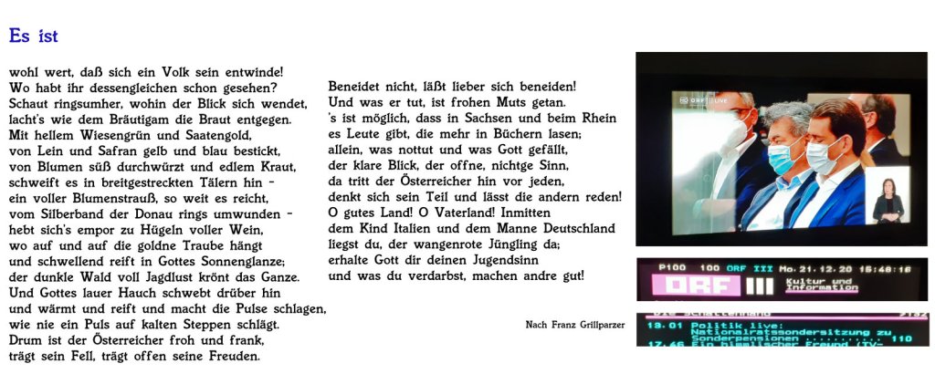 Österreich ist immer noch der „wangenrote Jüngling“, wie von Franz Grillparzer einst besungen. Wie an diesem 21. Dezember ’20 gedacht werden mußte, beim Anblick seines schlafenden Bundeskanzlers im Parlament. Am Nachmittag dieses Tages zwischen 13 und 16 Uhr. Der junge Bundeskanzler schlief nicht die ganze Zeit über. Zuerst besang er sich selbst.