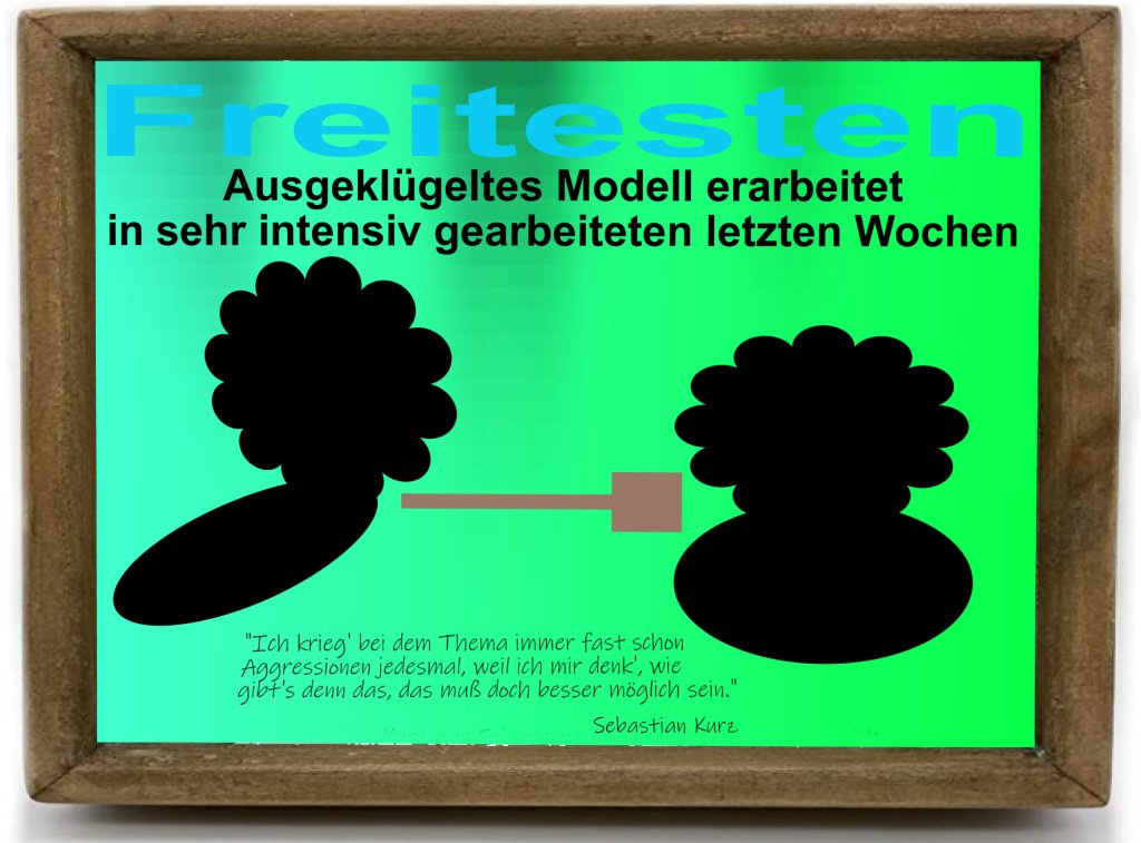 Was aus diesem zum Freitesten „erarbeiteten ausgeklügelten Modell“, an dem „in den letzten Wochen sehr intensiv gearbeitet“ wurde, geworden ist, das wird bereits an diesem Montag, 4. Jänner ’21, gewußt, ein Modell, das der zurzeitige Bundeskanzler sich zur Erinnerung an seine Zeit am Ballhausplatz rahmen lassen kann und sich selber, mit seinem Satz beschriftet, widmen kann: