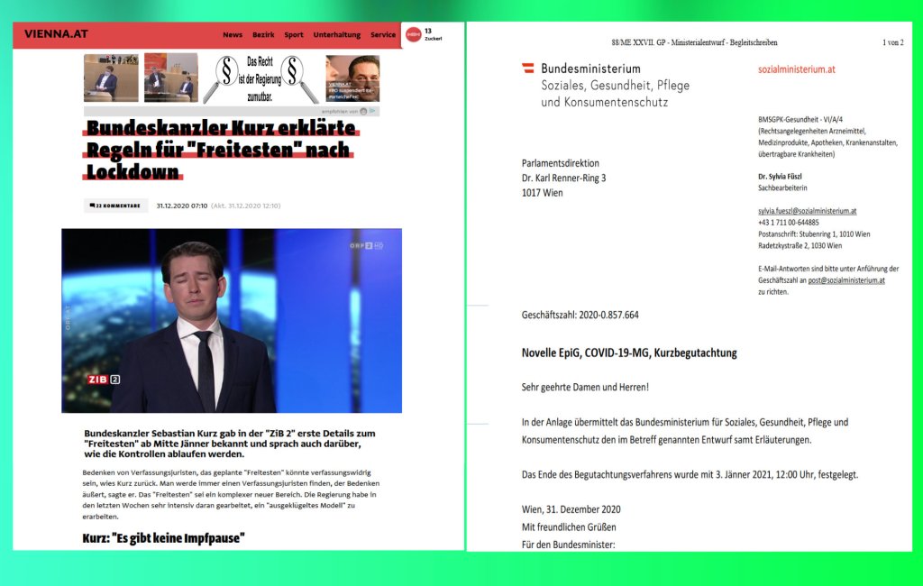 — Was das Freitesten betrifft, das ist natürlich ein neuer komplexer Bereich. Sie haben im Eingangsbericht schon Verfassungsexperten gebracht, die das skeptisch sehen. Was keine Überraschung ist, weil es gibt immer einen Verfassungsexperten, der jede neue Idee skeptisch sieht.