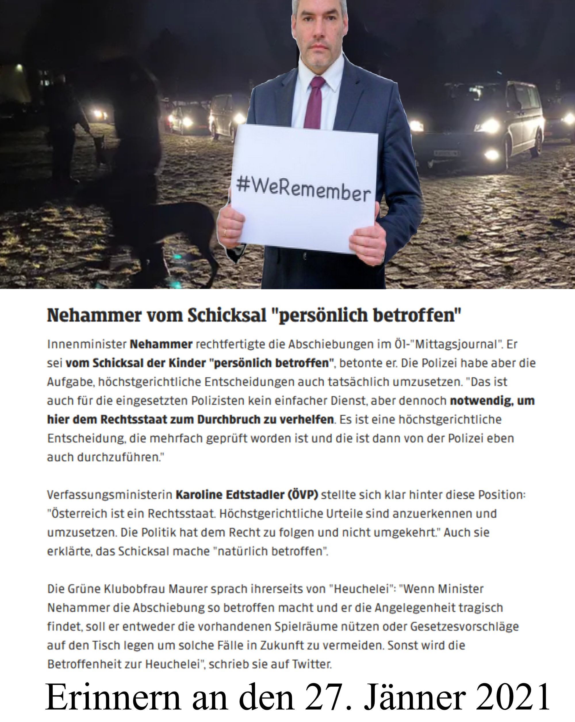 Lang noch wird die Erinnerung an die Nacht vom 27. Jänner von diesem Jahr an, geprägt von den Gedenken auch an den 27. Jänner 1945, nur die Erinnerung an die Nacht vom 27. Jänner 2021 sein.