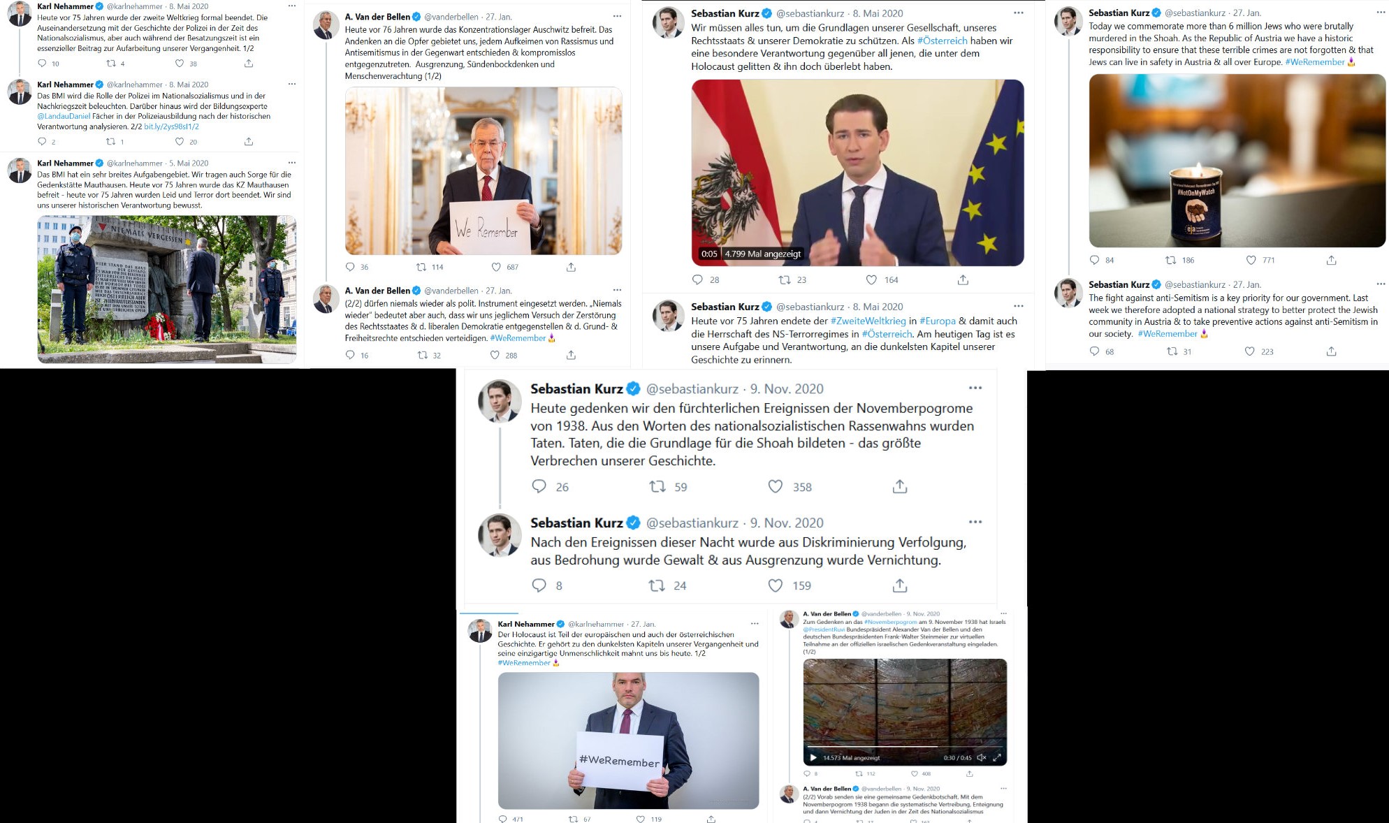 Am Gedenktag 27. Jänner 2021 läßt es sich der Innenminister bei Tag nicht nehmen, die Tafel „#WeRemember“ in die Kamera zu halten, auch am Gedenktag 27. Jänner 2021 läßt es sich der Bundespräsident bei Tag nicht nehmen, die Tafel „#WeRemember“ in die Kamera zu halten, am Gedenktag 27. Jänner 2021 ist auch der Bundeskanzler mit dabei, es sich nicht nehmen zu lassen, er stellt seinem „#WeRemember“ sogar ein Kerzchen bei.