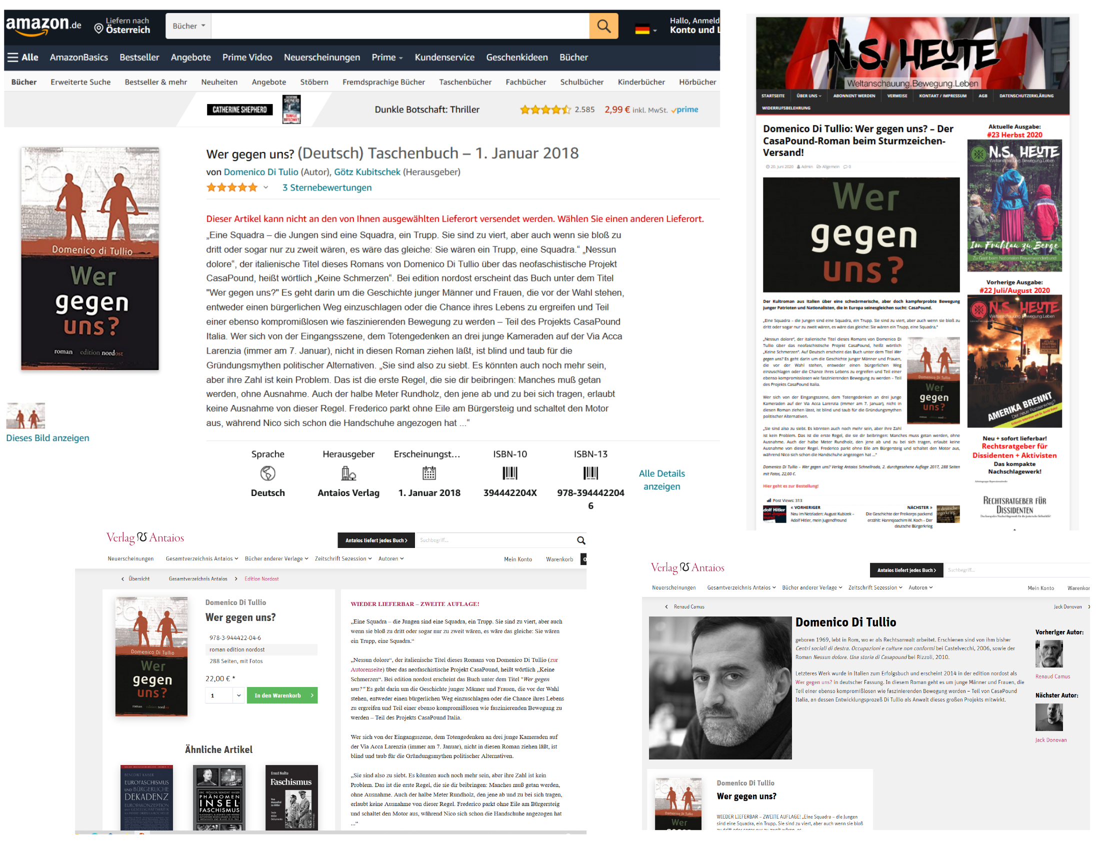 Domenico Di Tullio ist also Teil dieser neofaschistischen Gruppe. Diese Information aber verschweigt Amazon seiner Kundschaft, eine nicht unwichtige Information, um gleich zu erfahren, sofort wissen zu können, um was für eine Art Buch es sich bei diesem Roman handelt – um ein Propagandabuch.