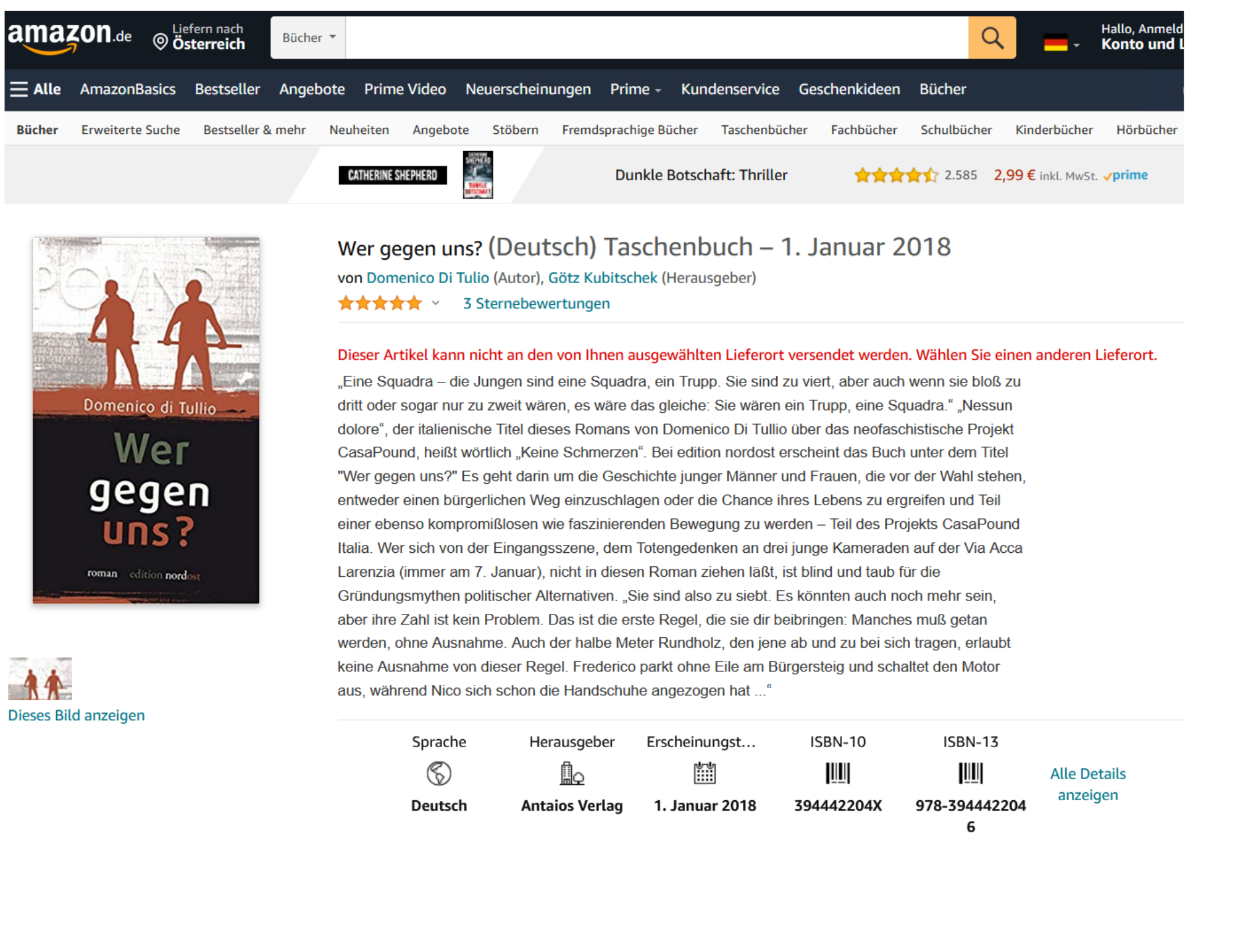 Das wäre beinahe eine erfreuliche Mitteilung von Amazon. Kämen da die, die gegen sich selbst sind, nicht immer wieder selbst nach Österreich, lieferten sich diese nicht immer wieder selbst aus, etwa nach Österreich, wie beispielsweise der Herausgeber dieses Propagandabuches „Unser Kampf – Wir gegen uns“, aber nicht um vor einem Mob aufzutreten, sondern, einfach wie kurz gesagt, vor einer illustren Gesellschaft, Vorträge zu halten, vor oder nach etwa einem Innenminister …