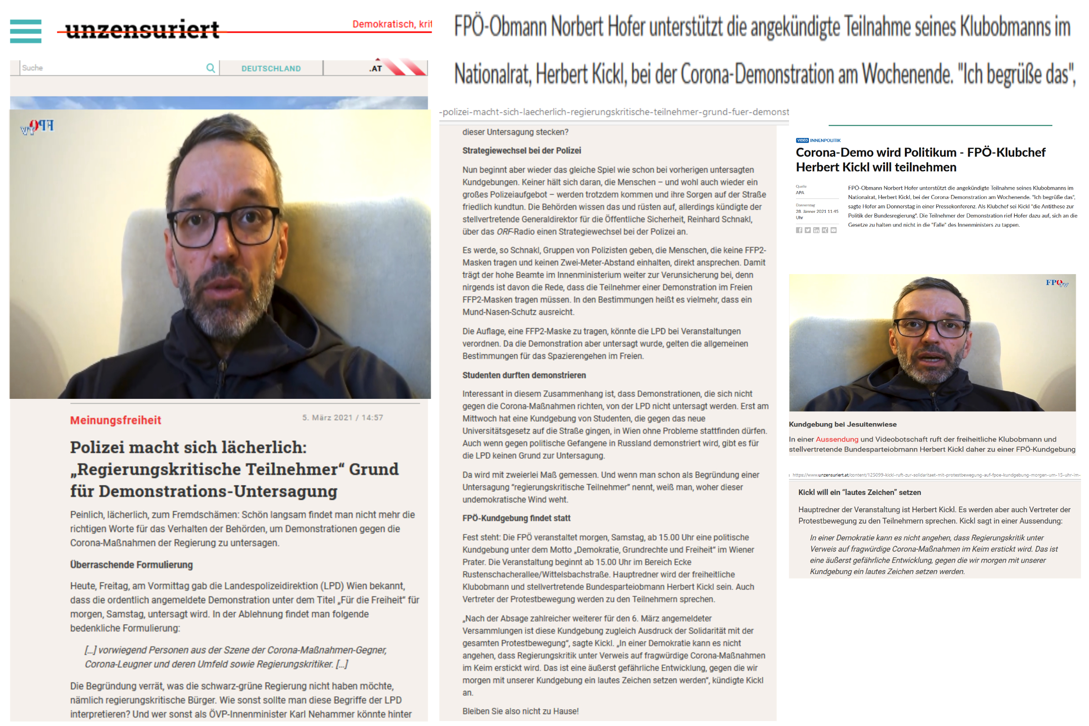 „Nach der Absage zahlreicher weiterer für den 6. März angemeldeter Versammlungen ist diese Kundgebung zugleich Ausdruck der Solidarität mit der gesamten Protestbewegung“, sagte Kickl. „In einer Demokratie kann es nicht angehen, dass Regierungskritik unter Verweis auf fragwürdige Corona-Maßnahmen im Keim erstickt wird. Das ist eine äußerst gefährliche Entwicklung, gegen die wir morgen mit unserer Kundgebung ein lautes Zeichen setzen werden“, kündigte Kickl an.