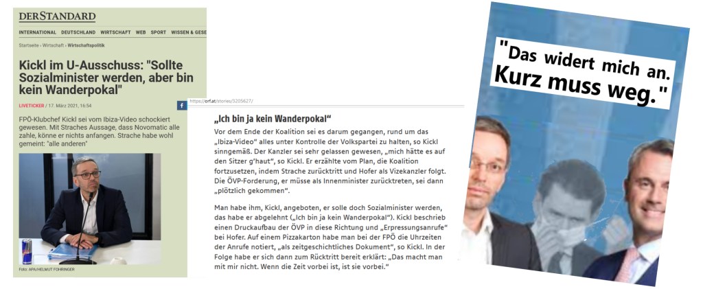 Vor wenigen Tagen hat der für kurz gewesene Innenminister im „Ibiza-Ausschuss“ ausgesagt, es sei von ihm gefordert worden, nicht mehr Innenminister zu sein, und dafür sei ihm, von der türkis getupften christschwarzen Partei angeboten worden, er soll Sozialminister werden, und der für kurz gewesene Infrastrukturminister soll Vizekanzler werden. Darin sah die türkis getupfte christschwarze Partei ihre Möglichkeit der Fortsetzung ihrer Regierung mit blauer Erduldung.