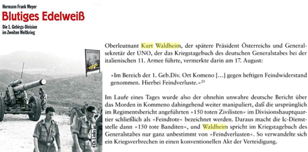 Oberleutnant Kurt Waldheim, der spätere Präsident Österreichs und Generalsekretär der UNO, der das Kriegstagebuch des deutschen Generalstabes bei der italienischen 11. Armee führte, vermerkte darin am 17. August: „Im Bereich der 1. Geb.Div. Ort Komeno […] gegen heftigen Feindwiderstand genommen. Hierbei Feindverluste.“ Im Laufe eines Tages wurde also der ohnehin unwahre deutsche Bericht über das Morden in Kommeno dahingehend weiter manipuliert, daß die ursprünglich im Regimentsbericht angeführten „150 toten Zivilisten“ im Divisionshauptquartier schließlich als „Feindtote“ bezeichnet werden. Daraus macht die Ic-Dienststelle dann „150 tote Banditen“, und Waldheim spricht im Kriegstagebuch des Generalstabes nur ganz unbestimmt von „Feindverlusten“. So verwandelte sich ein Kriegsverbrechen in einen konventionellen Akt der Verteidigung.