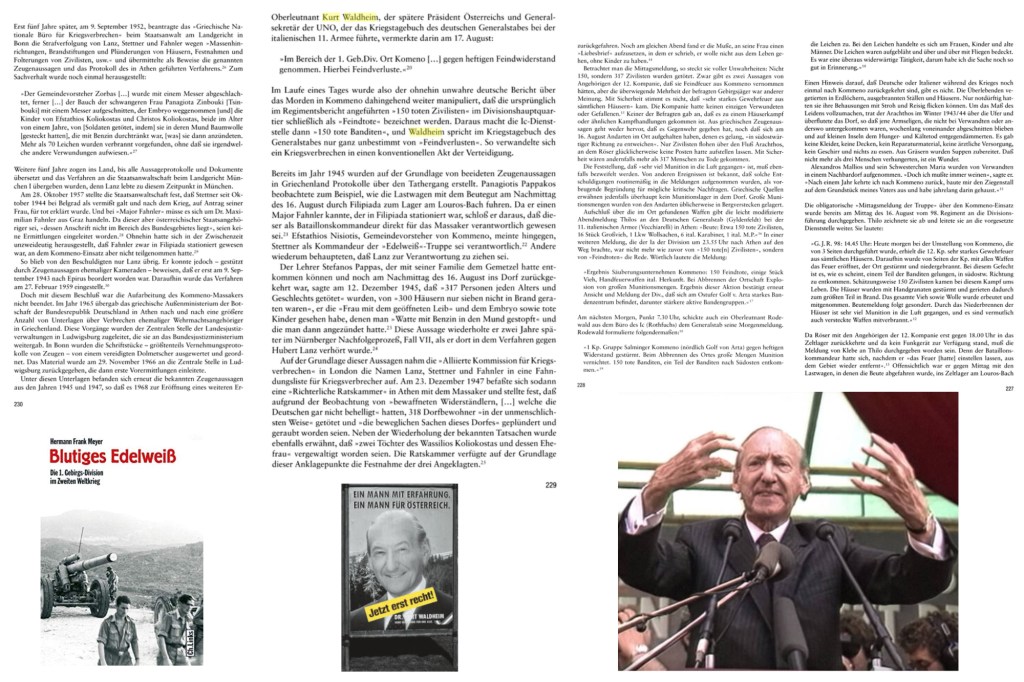 Die kurze Notiz des ehemaligen Oberbefehlhabers des österreichischen Bundesheeres über „Feindtote“ in Kommeno ist … Er setzte pflichtgemäß den Ermordeten die Maske des Feindes auf. In „Blutiges Edelweiß“ von Hermann Frank Meyer kann gelesen werden, was auch in Kommeno verbrochen wurde, wer die Menschen ohne waldheimische Masken waren, die ermordet wurden.