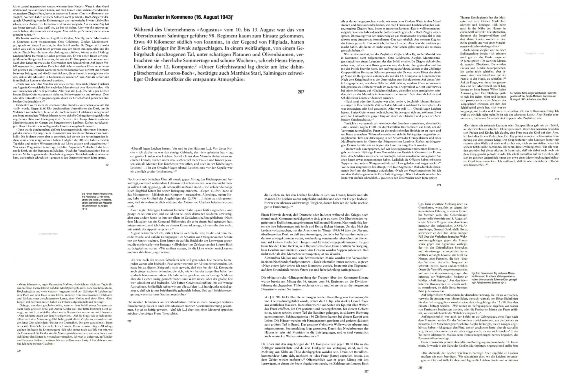 Oberleutnant Kurt Waldheim, der spätere Präsident Österreichs und Generalsekretär der UNO, der das Kriegstagebuch des deutschen Generalstabes bei der italienischen 11. Armee führte, vermerkte darin am 17. August: „Im Bereich der 1. Geb.Div. Ort Komeno […] gegen heftigen Feindwiderstand genommen. Hierbei Feindverluste.“ Im Laufe eines Tages wurde also der ohnehin unwahre deutsche Bericht über das Morden in Kommeno dahingehend weiter manipuliert, daß die ursprünglich im Regimentsbericht angeführten „150 toten Zivilisten“ im Divisionshauptquartier schließlich als „Feindtote“ bezeichnet werden. Daraus macht die Ic-Dienststelle dann „150 tote Banditen“, und Waldheim spricht im Kriegstagebuch des Generalstabes nur ganz unbestimmt von „Feindverlusten“. So verwandelte sich ein Kriegsverbrechen in einen konventionellen Akt der Verteidigung.