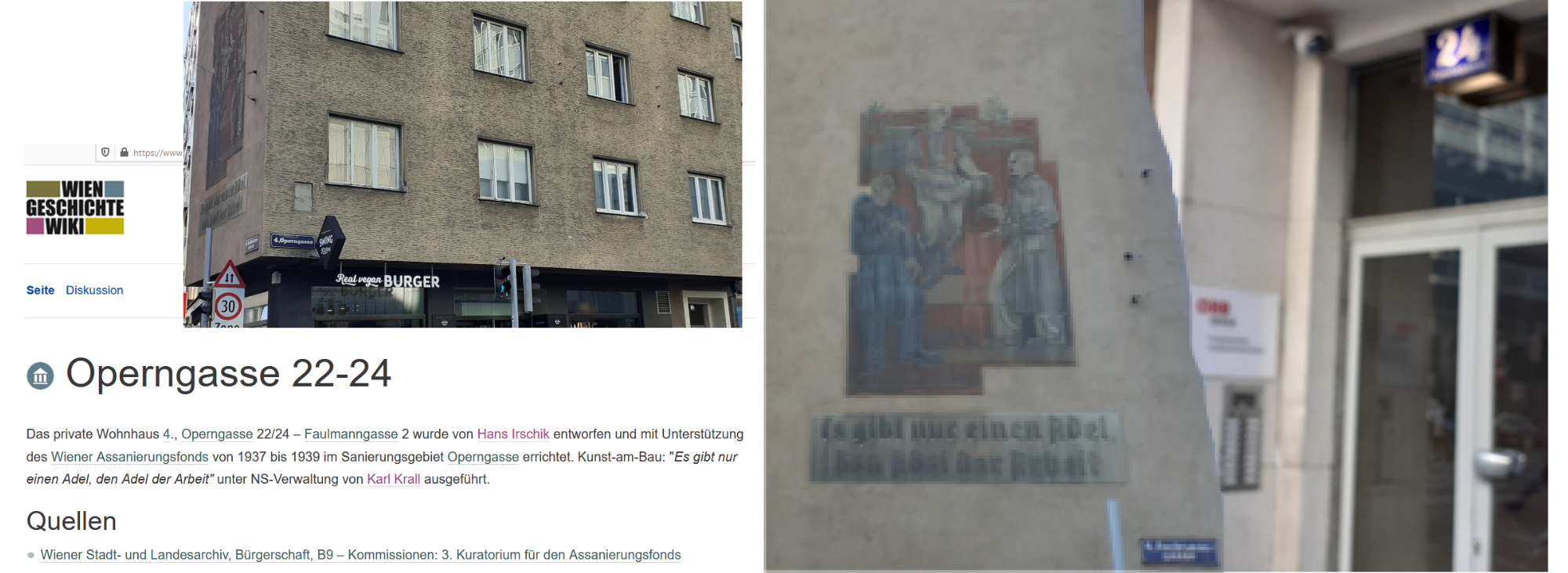 Ganz leicht zu erkennen sind sie nicht, die drei auf dem Relief auf dem Haus Ecke Operngasse und Faulmanngasse. „Es gibt nur einen Adel / den Adel der Arbeit“, prangt darunter. Fertiggestellt 1939, das Zitat dazu stammt von Adolf Hitler. Der Verweis auf Hitler wurde in den Nachkriegsjahren entfernt, der Rest gelassen. Einmal mehr zeigt sich, wie sichtbar und unsichtbar zugleich die Spuren von Nationalsozialismus und Austrofaschismus in Wien noch sind. Den Bau des Hauses trieb nämlich der Assanierungsfonds voran, eine Einrichtung des ständestaatlichen Wien, die ab 1934 privaten Wohnbau förderte und die Gemeindebautätigkeit des Roten Wien ersetzen sollte. Wie viele TU-Studenten und Naschmarkt-Besucher das Relief wohl für eine harmlose Arbeitsermunterung hielten?