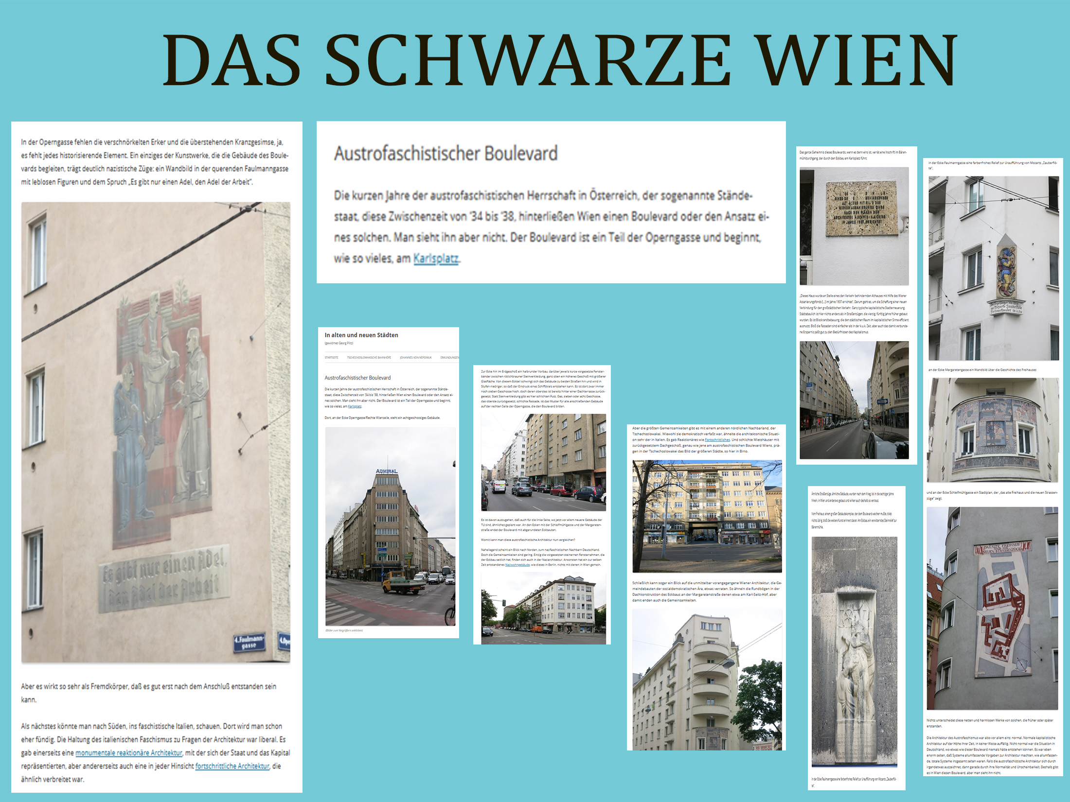 Er schreibt über dieses Grätzel mit verlängerter Operngasse u.a. von „kapitalistischer Stadterneuerung“, von der „normalen kapitalistischen Architektur des Austrofaschismus“ … Das scheint passender als „austrofaschistischer Boulevard“, passender zu dieser Gasse, vor allem auch weil es besser paßt zu dem dort fett aufgemalten Spruch „Es gibt nur einen Adel, den Adel der Arbeit“ (Kruhi 176).