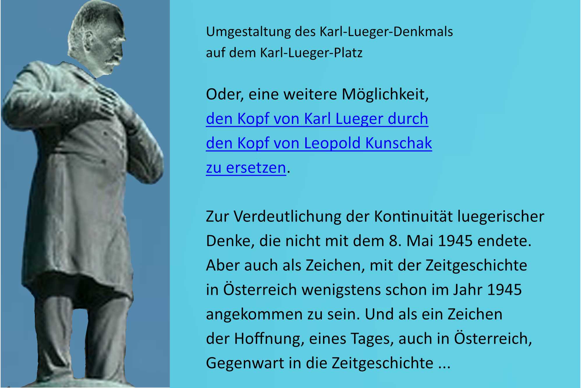 Oder, eine weitere Möglichkeit, den Kopf von Karl Lueger durch den Kopf von Leopold Kunschak zu ersetzen. Zur Verdeutlichung der Kontinuität luegerischer Denke, die nicht mit dem 8. Mai 1945 endete. Aber auch als Zeichen, mit der Zeitgeschichte in Österreich wenigstens im Jahr 1945 angekommen zu sein. Und als ein Zeichen der Hoffnung, eines Tages, auch in Österreich, Gegenwart in die Zeitgeschichte …
