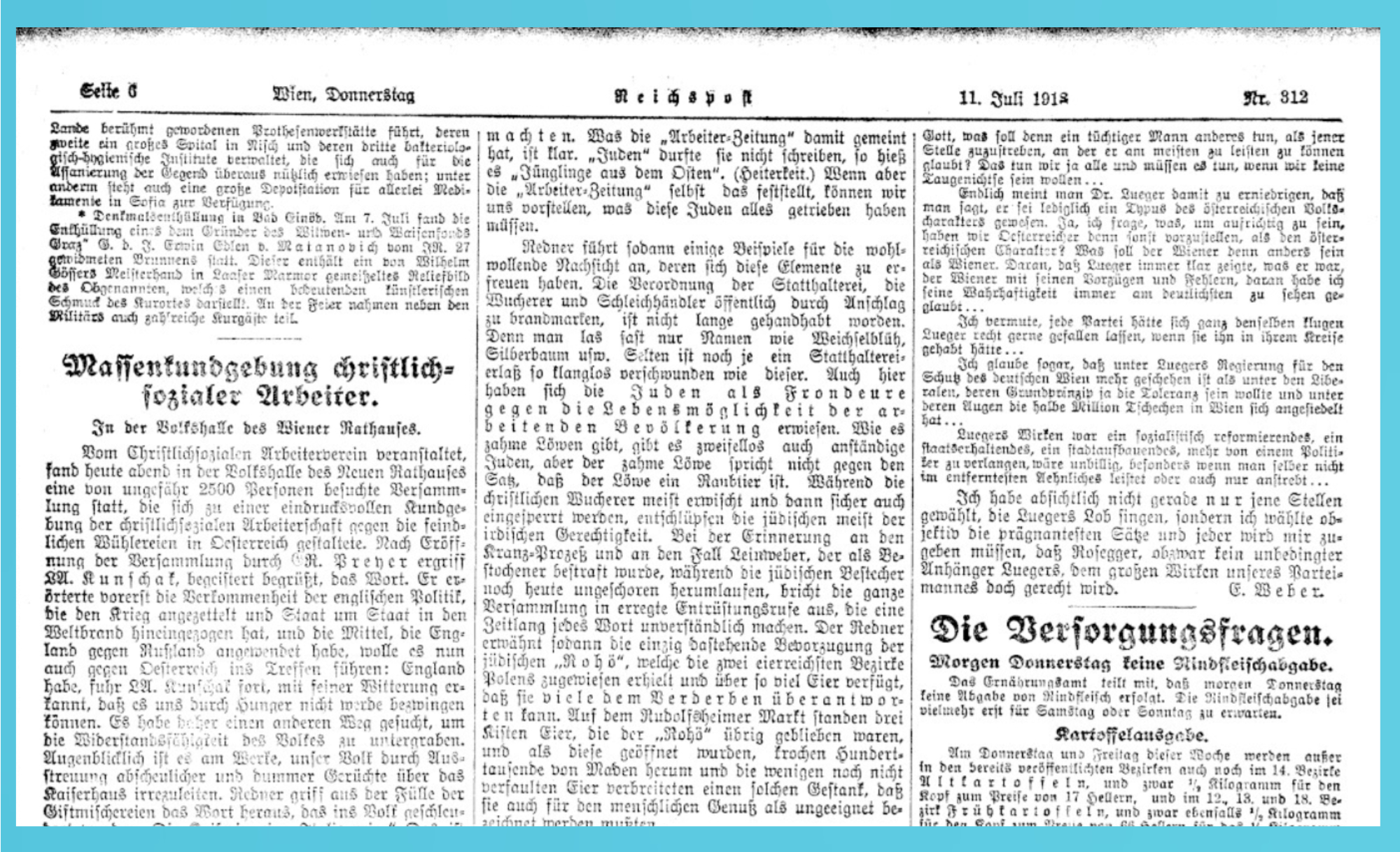 Diesen Bericht in seiner Gesamtheit wiederzugeben, einhundertdrei Jahre danach an die Rede in der Volkshalle des Wiener Rathauses zu erinnern, ist durchaus gerechtfertigt, erinnert doch diese Rede sehr an die Gegenwart, beispielsweise wie der Redner, der spätere Nationalratspräsident, mit der Wahrheit umgeht. Heutzutage würde dazu gesagt werden, der Nationalratspräsident verbreite „Fake News“. Und auch, was seit einhundertdrei Jahren sich hartnäckig hält, was heutzutage weiter Hetze genannt wird, wohin diese damalige Hetze führte, die den Nationalratspräsidenten nach dem Untergang des deutschen reiches nicht veranlaßte, seinen Antisemitismus aufzugeben. Und wie alle „Fake News“ hat auch die nationalratspräsidentische Rede Heiteres zu bieten, und das Heitere ist gerade in sogenannten Krisen, einfach wie kurz gesagt, in der damaligen wie in der heutigen notwendig und willkommen.