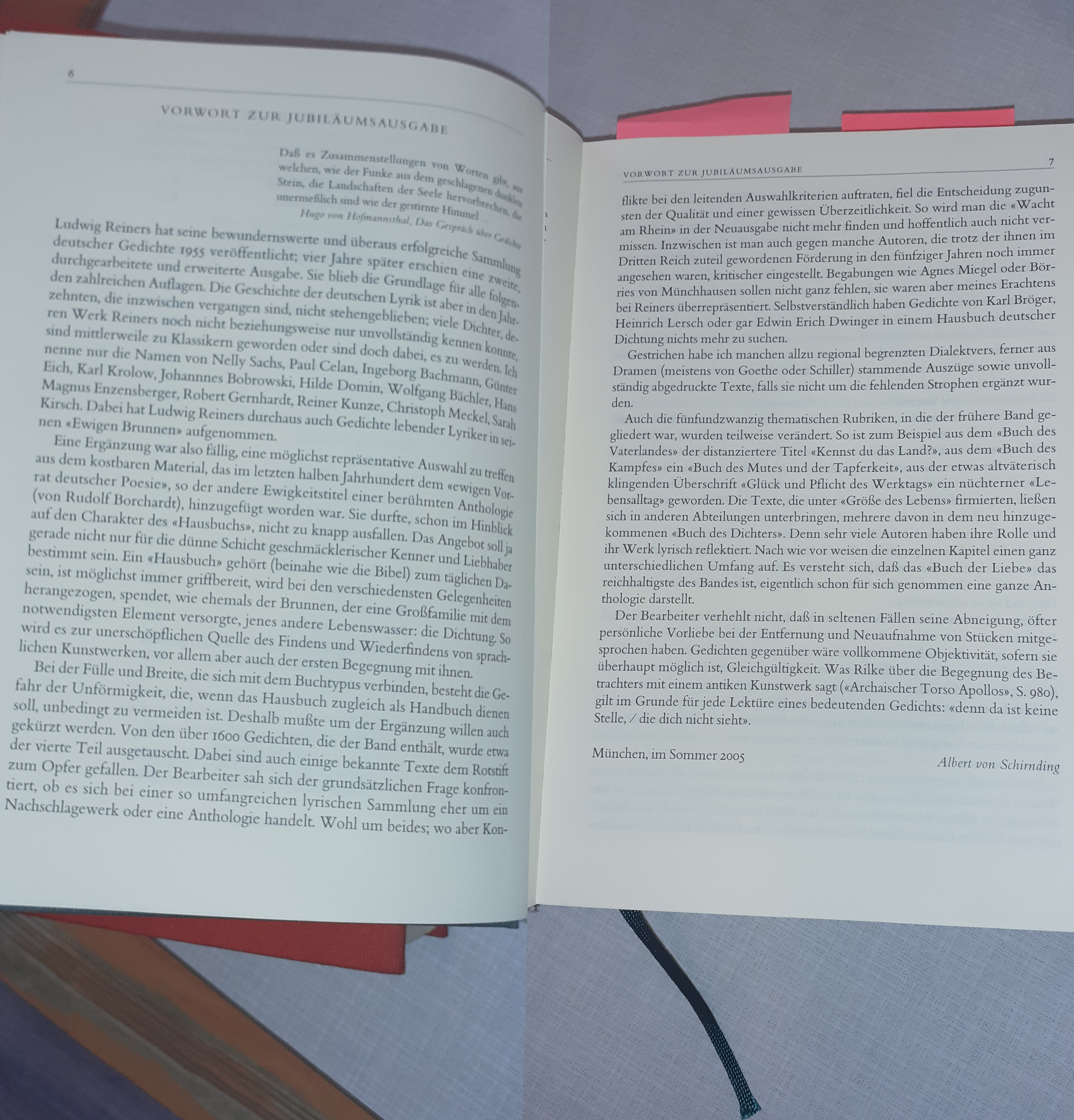 Albert von Schirnding schreibt in seinem Vorwort, „Ludwig Reiners hat seine bewunderswerte und überaus erfolgreiche Sammlung deutsche Gedichte 1955 …“ und „ein ‚Hausbuch‘ gehört (beinahe wie die Bibel) zum täglichen Dasein, ist möglichst immer griffbereit,“ und so weiter und so fort.