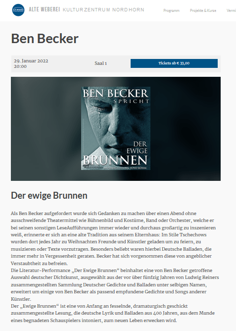 PS „Alte Traditionen“ leben wieder auf, „im Stile Tschechows“, wie aus einer Programmankündigung für den 29. Jänner 2022 zu lesen ist, Ben Becker werde aus dem „Volksbuch Der Ewige Brunnen“ deutsche Verse sprechen, menschgemäß um einige durch ihn, Becker, als passend empfundene Gedichte erweitert, vielleicht um jene, die Albert von Schirnding nicht mehr … zu befreien, oh ehrenhaftes Ansinnen, von Verstaubtheit, die nur angeblich wie die Zeit nun so reif, aus Staub neues Leben zu erwecken …