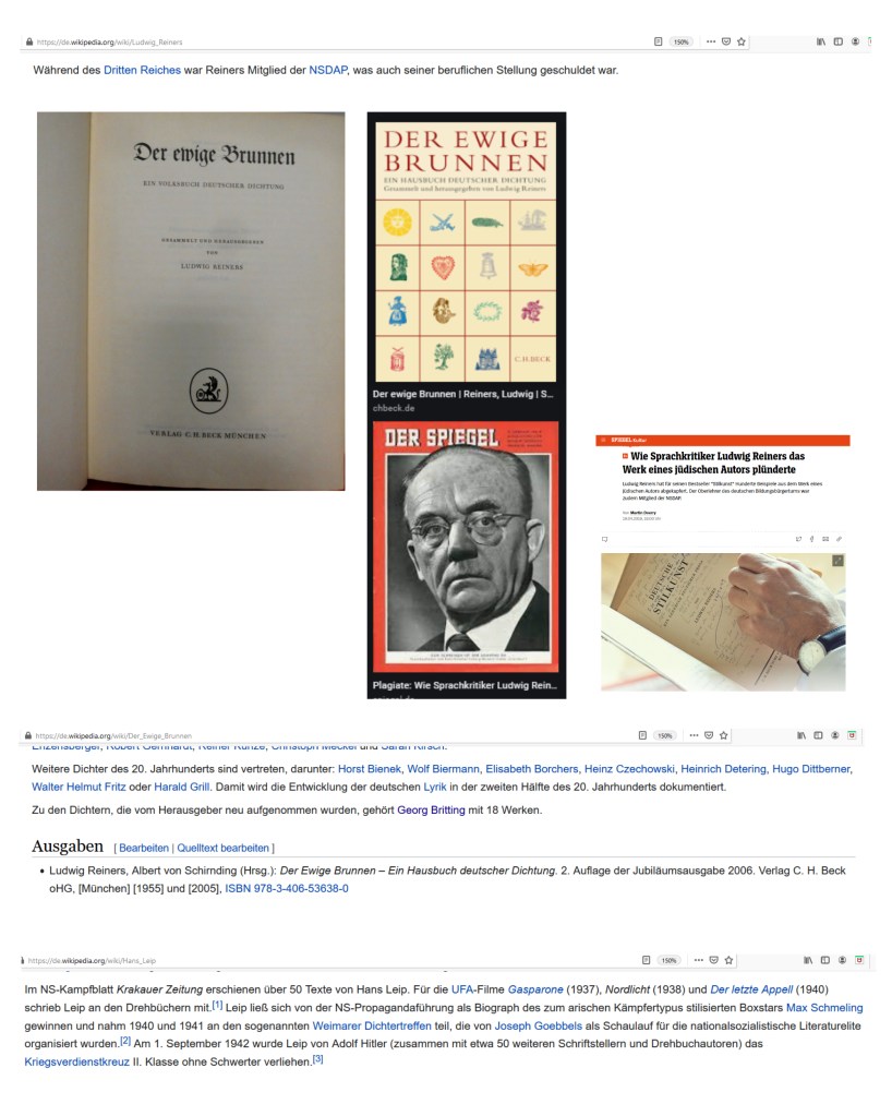 „Wikipedia“ erzählt ebenfalls nichts im Beitrag über den „ewigen Brunnen“, daß Ludwig Reiners ein NSDAP-Mitglied war. Immerhin aber ist aus diesem Beitrag über den „ewigen Brunnen“ zu erfahren, daß vom Herausgeber neu aufgenommen wurde: Georg Britting — —