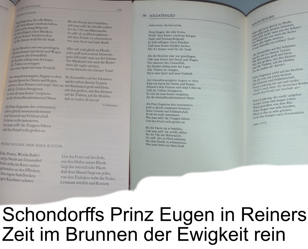 Daß mit beiden Büchern der Zuneigung gefrönt wird, Gedichte auch von Unbekannten zu bringen, etwa dieses über Prinz Eugen, in der einen Bibel unter „Aus der Geschichte“, in der anderen Bibel unter „Soldatenlied“ …