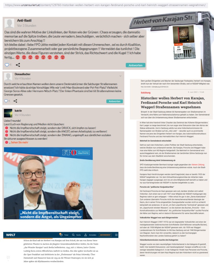 Um die Benennung von Straßen nach „Verdammten“, deren „Andenken“ sie oder er vor der „Verfluchung“ gerettet wissen will. Es ist dabei auch Größe im Spiel, wenn im Kommentar der Website für Karl Lueger Partei ergriffen wird, vielleicht auch in Erinnerung an die gute alte Zeit der gemeinsamen Regierung für kurz …