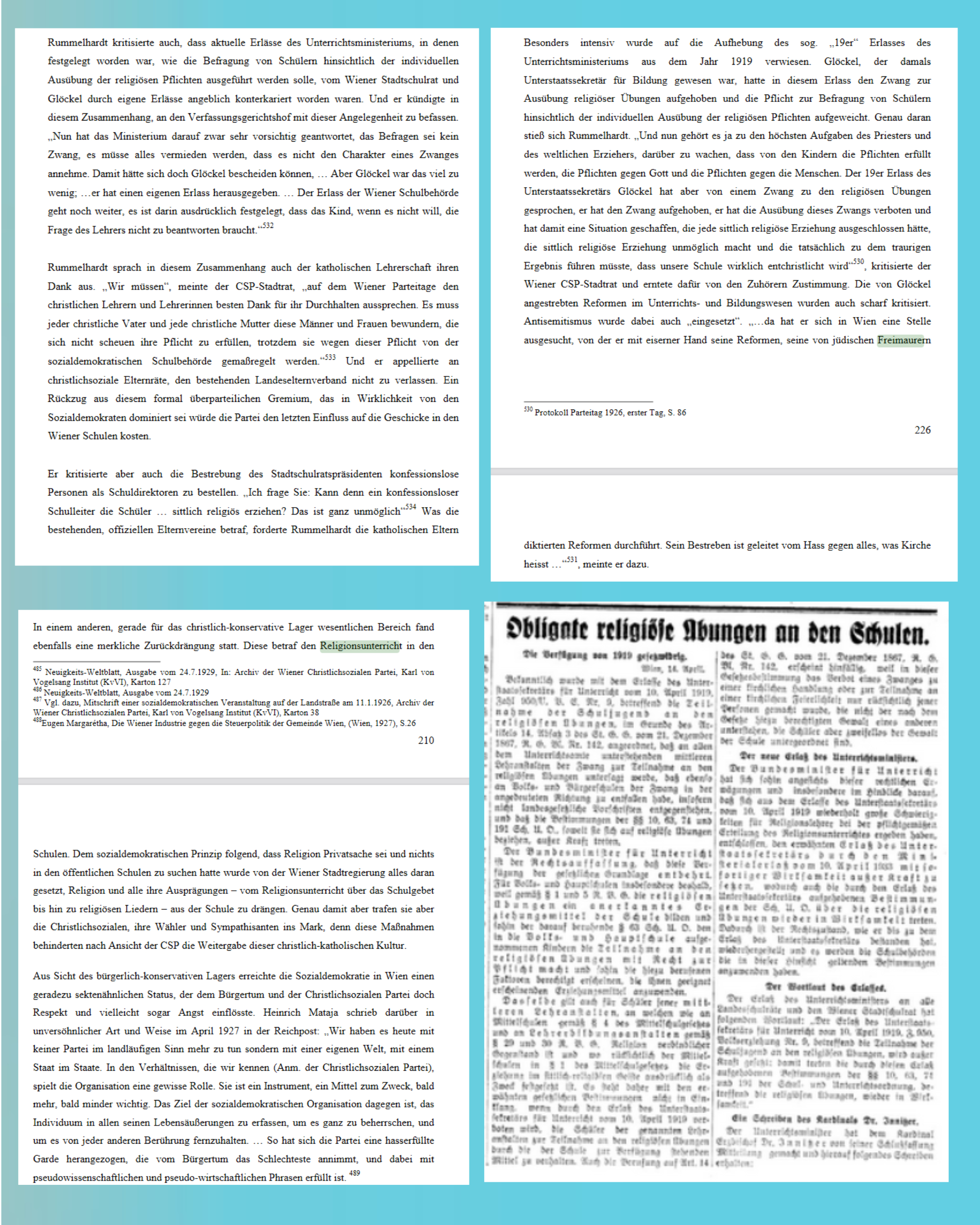 Besonders intensiv wurde auf die Aufhebung des sog. „19er“ Erlasses des Unterrichtsministeriums aus dem Jahr 1919 verwiesen. Glöckel, der damals Unterstaatssekretär für Bildung gewesen war, hatte in diesem Erlass den Zwang zur Ausübung religiöser Übungen aufgehoben und die Pflicht zur Befragung von Schülern hinsichtlich der individuellen Ausübung der religiösen Pflichten aufgeweicht. Genau daran stieß sich Rummelhardt. „Und nun gehört es ja zu den höchsten Aufgaben des Priesters und des weltlichen Erziehers, darüber zu wachen, dass von den Kindern die Pflichten erfüllt werden, die Pflichten gegen Gott und die Pflichten gegen die Menschen. Der 19er Erlass des Unterstaatssekretärs Glöckel hat aber von einem Zwang zu den religiösen Übungen gesprochen, er hat den Zwang aufgehoben, er hat die Ausübung dieses Zwangs verboten und hat damit eine Situation geschaffen, die jede sittlich religiöse Erziehung ausgeschlossen hätte, die sittlich religiöse Erziehung unmöglich macht und die tatsächlich zu dem traurigen Ergebnis führen müsste, dass unsere Schule wirklich entchristlicht wird“530, kritisierte der Wiener CSP-Stadtrat und erntete dafür von den Zuhörern Zustimmung. Die von Glöckel angestrebten Reformen im Unterrichts- und Bildungswesen wurden auch scharf kritisiert. Antisemitismus wurde dabei auch „eingesetzt“. „…da hat er sich in Wien eine Stelle ausgesucht, von der er mit eiserner Hand seine Reformen, seine von jüdischen Freimaurern diktierten Reformen durchführt. Sein Bestreben ist geleitet vom Hass gegen alles, was Kirche heisst …“531, meinte er dazu. Rummelhardt kritisierte auch, dass aktuelle Erlässe des Unterrichtsministeriums, in denen festgelegt worden war, wie die Befragung von Schülern hinsichtlich der individuellen Ausübung der religiösen Pflichten ausgeführt werden solle, vom Wiener Stadtschulrat und Glöckel durch eigene Erlässe angeblich konterkariert worden waren. Und er kündigte in diesem Zusammenhang, an den Verfassungsgerichtshof mit dieser Angelegenheit zu befassen. „Nun hat das Ministerium darauf zwar sehr vorsichtig geantwortet, das Befragen sei kein Zwang, es müsse alles vermieden werden, dass es nicht den Charakter eines Zwanges annehme. Damit hätte sich doch Glöckel bescheiden können, … Aber Glöckel war das viel zu wenig; …er hat einen eigenen Erlass herausgegeben. … Der Erlass der Wiener Schulbehörde geht noch weiter, es ist darin ausdrücklich festgelegt, dass das Kind, wenn es nicht will, die Frage des Lehrers nicht zu beantworten braucht.“532Rummelhardt sprach in diesem Zusammenhang auch der katholischen Lehrerschaft ihren Dank aus. „Wir müssen“, meinte der CSP-Stadtrat, „auf dem Wiener Parteitage den christlichen Lehrern und Lehrerinnen besten Dank für ihr Durchhalten aussprechen. Es muss jeder christliche Vater und jede christliche Mutter diese Männer und Frauen bewundern, die sich nicht scheuen ihre Pflicht zu erfüllen, trotzdem sie wegen dieser Pflicht von der sozialdemokratischen Schulbehörde gemaßregelt werden.“533 Und er appellierte an christlichsoziale Elternräte, den bestehenden Landeselternverband nicht zu verlassen. Ein Rückzug aus diesem formal überparteilichen Gremium, das in Wirklichkeit von den Sozialdemokraten dominiert sei würde die Partei den letzten Einfluss auf die Geschicke in den Wiener Schulen kosten. Er kritisierte aber auch die Bestrebung des Stadtschulratspräsidenten konfessionslose Personen als Schuldirektoren zu bestellen. „Ich frage Sie: Kann denn ein konfessionsloser Schulleiter die Schüler … sittlich religiös erziehen? Das ist ganz unmöglich“534