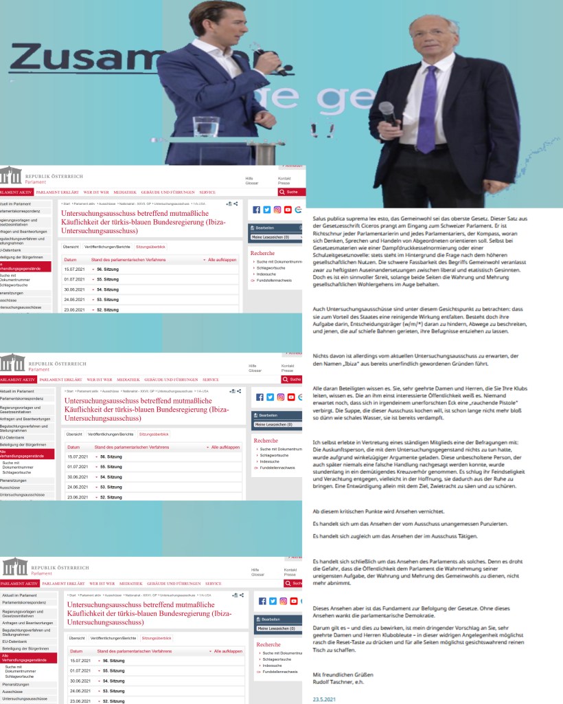 Es stehen noch fünf Sitzungen des Untersuchungsausschußes betreffend mutmaßliche Käuflichkeit der türkis-blauen Bundesregierung aus, von heute, 14. Juni 2021 weg. In fünf Tagungen werden noch Zeugen befragt werden, an fünf Tagen bis zur Mitte des nächsten Monats werden also weiter Zeuginnen befragt werden zur mutmaßlichen Käuflichkeit der türkis-blauen Bundesregierung, aber er, Rudolf Taschner, ersucht bereits in seinem falsch adressierten offenen Brief vom 23. Mai 2021, die „Reset-Taste“ zu drücken. Worunter nur verstanden werden kann, er, Rudolf Taschner, möchte, daß der Untersuchungsausschuß betreffend mutmaßliche Käuflichkeit der türkis-blauen Bundesregierung vorzeitig endet, also keine Tagungen mehr stattfinden, keine Befragungen nach dem 23. Mai 2021 mehr durchgeführt werden, damit seine „unbescholtene Person“, die vielleicht auch noch einmal zur Befragung geladen in den Ausschuß muß, nicht noch einmal in den Ausschuß geladen werden kann, seine „unbescholtene Person“ erlöst wird.