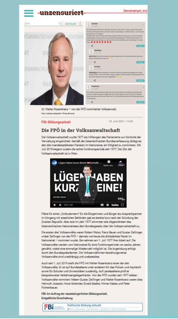 FBI verbindet mit der Volksanwaltschaft in Österreich mit FPÖ, eine Partei als Volksanwältin, Rosenkranz als Partei oder Partei als Rosenkranz in der Volksanwaltschaft … Die Überparteilichkeit wird nach der Werbung vom FBI von Walter Rosenkranz also über Parteilichkeit erfüllt. Das kann nach dem FBI durch eine Formel einfach wie kurz ausgedrückt werden kann: