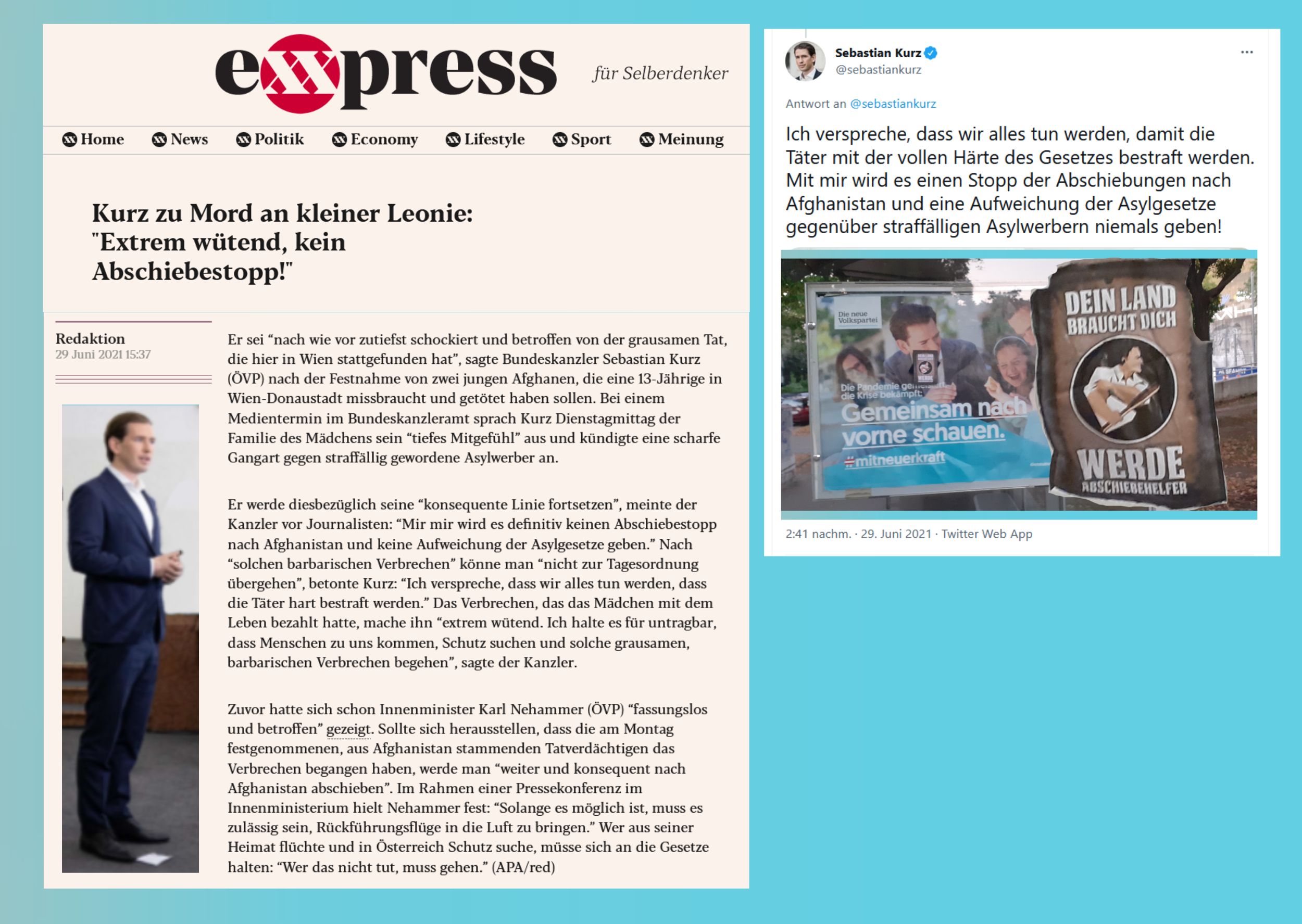 Er werde diesbezüglich seine “konsequente Linie fortsetzen”, meinte der Kanzler vor Journalisten: “Mir mir wird es definitiv keinen Abschiebestopp nach Afghanistan und keine Aufweichung der Asylgesetze geben.” Nach “solchen barbarischen Verbrechen” könne man “nicht zur Tagesordnung übergehen”, betonte Kurz: “Ich verspreche, dass wir alles tun werden, dass die Täter hart bestraft werden.” Das Verbrechen, das das Mädchen mit dem Leben bezahlt hatte, mache ihn “extrem wütend. Ich halte es für untragbar, dass Menschen zu uns kommen, Schutz suchen und solche grausamen, barbarischen Verbrechen begehen”, sagte der Kanzler.