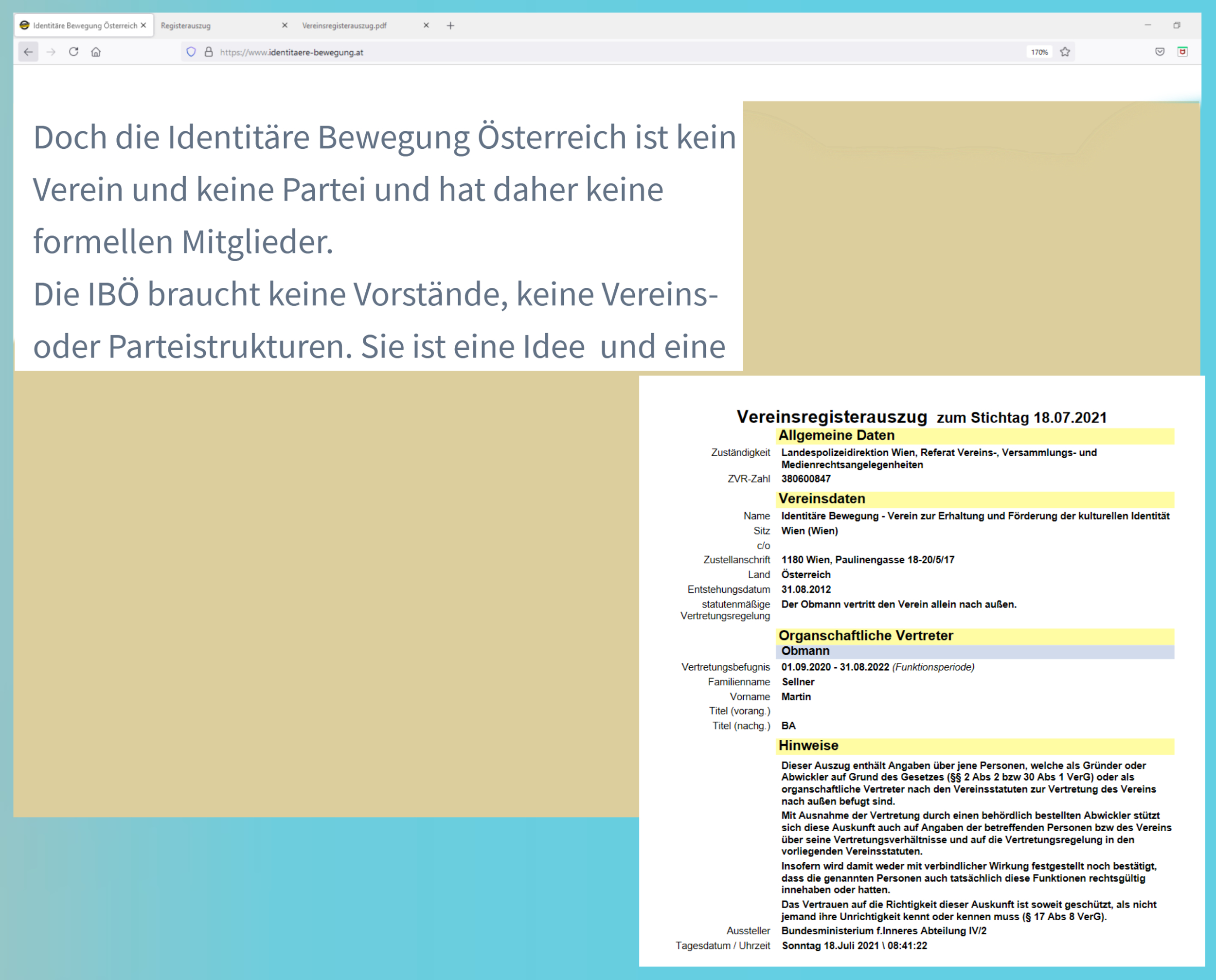 Apostelinnen gleich schleichen sie durch das Land und wollen die Menschen identitär aufk…, nein, nicht aufklären, bek…, nein, nicht bekehren, Sand aufkehren zum Streuen in die Augen der Menschen, und sie wissen um ihre Identität gar nicht einmal selbst Bescheid, die nichts anderes ist als eine Vereinsmeieridentität. Wie im Vereinsregisterauszug vom 18. Juli 2021 zu lesen: ein Verein mit Vereinsstrukturen, mit einem Obmann, mit einem Vorstand, und es muss nach dem Vereinsrecht Mitglieder geben, die den Vorstand, die den Obmann wählen, der bis zum 31. August ’22 organschaftlicher Vertreter der identitären Vereinsmeierei …