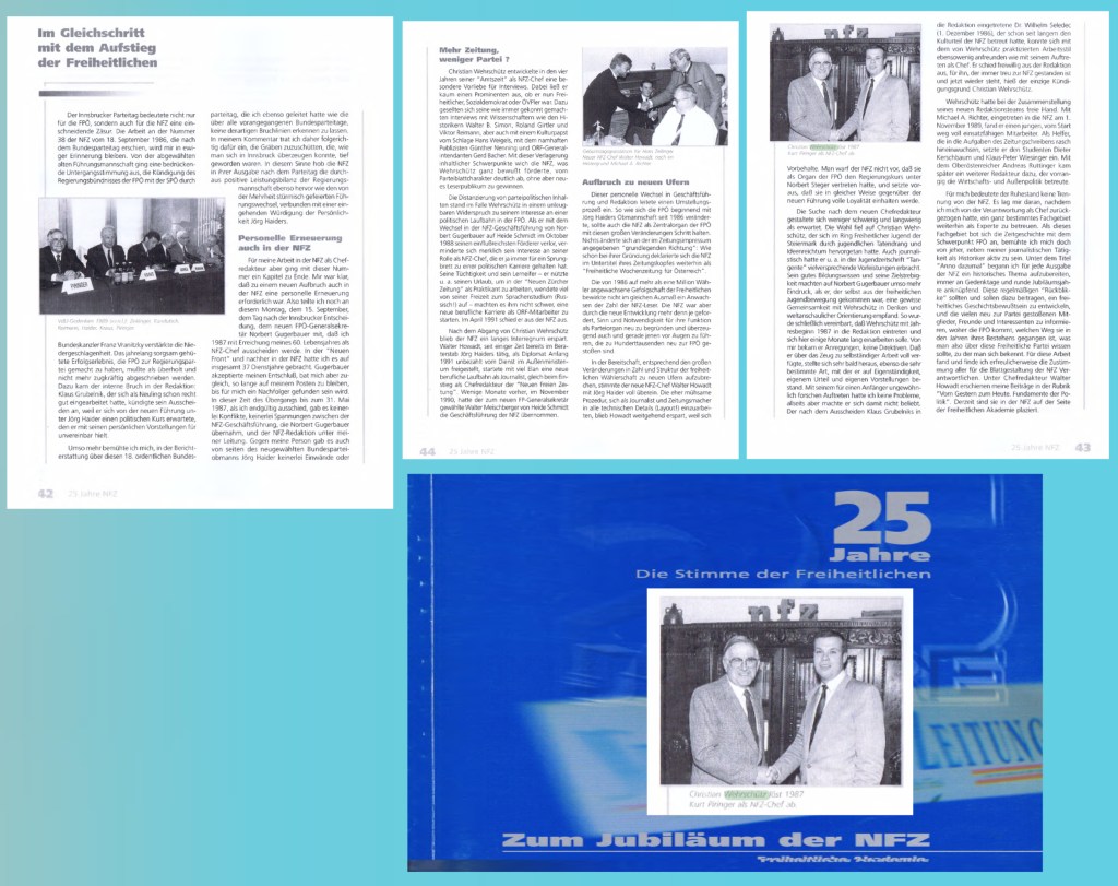 Wehrschütz hatte bei der Zusammenstellung seines neuen Redaktionsteams freie Fland. Mit Michael A. Richter, eingetreten in die NFZ am 1. November 1989, fand er einen jungen, vom Start weg voll einsatzfähigen Mitarbeiter. Als Flelfer, die in die Aufgaben des Zeitungschreibens rasch hineinwuchsen, setzte er den Studenten Dieter Kerschbaum und Klaus-Peter Wiesinger ein. Mit dem Oberösterreicher Andreas Ruttinger kam später ein weiterer Redakteur dazu, der vorrangig die Wirtschafts- und Außenpolitik betreute. Für mich bedeutete der Ruhestand keine Trennung von der NFZ. Es lag mir daran, nachdem ich mich von der Verantwortung als Chef zurückgezogen hatte, ein ganz bestimmtes Fachgebiet weiterhin als Experte zu betreuen. Als dieses Fachgebiet bot sich die Zeitgeschichte mit dem Schwerpunkt FPÖ an, bemühte ich mich doch von jeher, neben meiner journalistischen Tätigkeit als Historiker aktiv zu sein. Unter dem Titel „Anno dazumal“ begann ich für jede Ausgabe der NFZ ein historisches Thema aufzubereiten, immer an Gedenktage und runde Jubiläumsjahre anknüpfend. Diese regelmäßigen „Rückblicke“ sollten und sollen dazu beitragen, ein freiheitliches Geschichtsbewußtsein zu entwickeln, und die vielen neu zur Partei gestoßenen Mitglieder, Freunde und Interessenten zu informieren, woher die FPÖ kommt, welchen Weg sie in den Jahren ihres Bestehens gegangen ist, was man also über diese Freiheitliche Partei wissen sollte, zu der man sich bekennt. Für diese Arbeit fand und finde ich erfreulicherweise die Zustimmung aller für die Blattgestaltung der NFZ Verantwortlichen. Unter Chefredakteur Walter Howadt erschienen meine Beiträge in der Rubrik „Vom Gestern zum Heute. Fundamente der