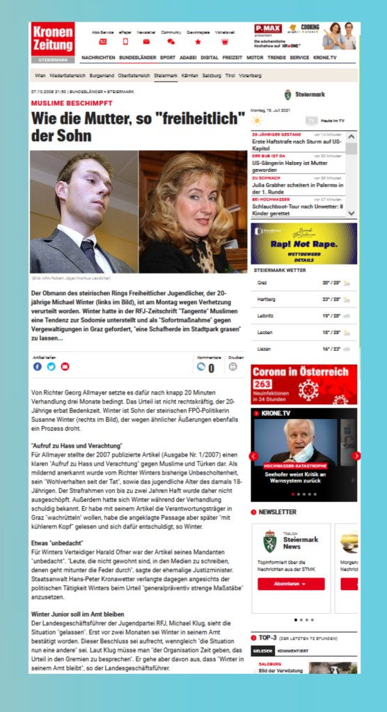 Auf den heutigen Tag genau zehn Jahre später, am 19. Juli 2021, schaltet das FBI in der gesinnungsgemäß zensurierten Website wieder einmal eine Werbung, diesmal: „Die FPÖ und ihre Medien“, mit der sie daran erinnert:
