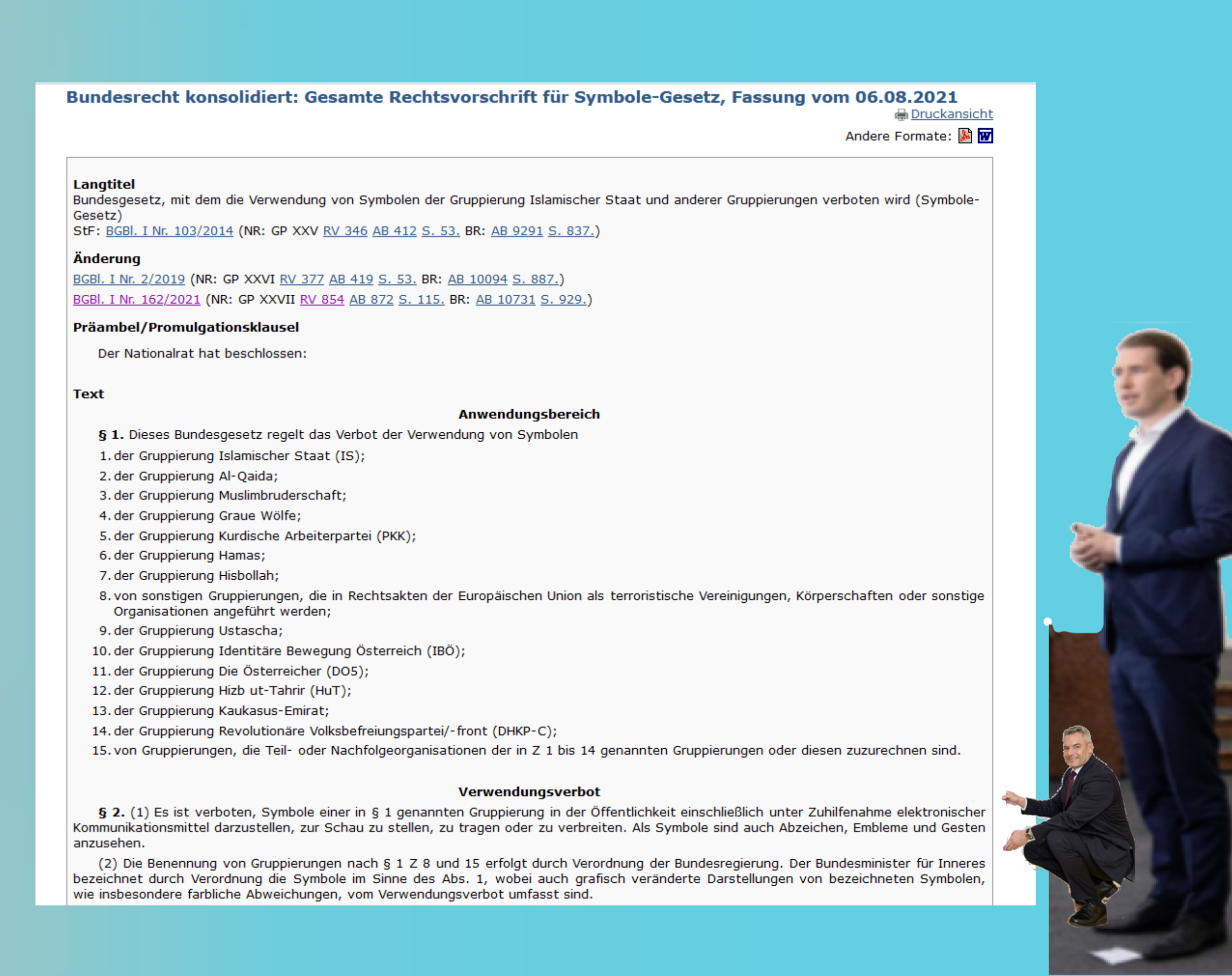 (2) Die Benennung von Gruppierungen nach § 1 Z 8 und 15 erfolgt durch Verordnung der Bundesregierung. Der Bundesminister für Inneres bezeichnet durch Verordnung die Symbole im Sinne des Abs. 1, wobei auch grafisch veränderte Darstellungen von bezeichneten Symbolen, wie insbesondere farbliche Abweichungen, vom Verwendungsverbot umfasst sind.