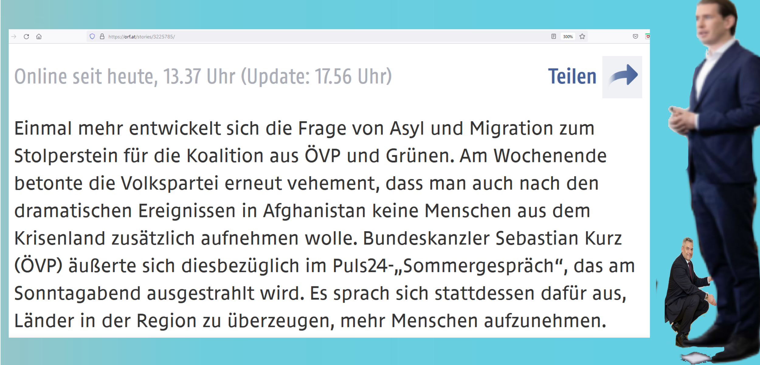 Einmal mehr entwickelt sich die Frage von Asyl und Migration zum Stolperstein für die Koalition aus ÖVP und Grünen. Am Wochenende betonte die Volkspartei erneut vehement, dass man auch nach den dramatischen Ereignissen in Afghanistan keine Menschen aus dem Krisenland zusätzlich aufnehmen wolle. Bundeskanzler Sebastian Kurz (ÖVP) äußerte sich diesbezüglich im Puls24-„Sommergespräch“, das am Sonntagabend ausgestrahlt wird. Es sprach sich stattdessen dafür aus, Länder in der Region zu überzeugen, mehr Menschen aufzunehmen.