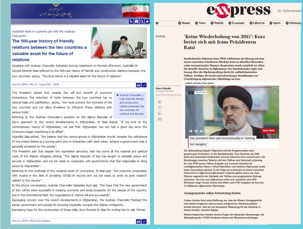 In this phone conversation, Austrian Chancellor Sebastian Kurz said, „We hope that the new government of Iran will be more successful in creating economic and social prosperity for the people of the country, and in the international field, the negotiations in Vienna will end successfully“.
