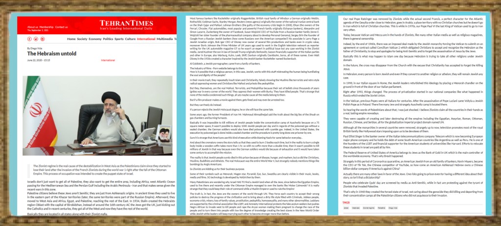 Ist doch in diesem exemplarischen Artikel „The Hebraism untold“ so recht enthalten, was ihnen beispielsweise die „Lügenpresse“, wie sie, die von der Wahrheit Trunkenen, amtliche und klassische Medien im sogenannten Westen und also auch in Österreich nennen, weigert zu veröffentlichen, ihnen, den Süchtigen nach dem echten und reinen Druck, der im Iran höchst staatlich … Wie müssen doch die Gesinnungskämpfenden etwa in Österreich sich täglich in den Schlaf weinen, wenn sie in der iranischen Presse lesen, wie in dieser Menschen vorgeführt werden, genauso vorgeführt werden, wie sie es gesinnungsgemäß begehren, wie es ihrer gesinnungsgemäßen Wahrheit ganz und gar entspricht. Hingegen in den Medien im sogenannten Westen, auch in Österreich, werden diese im Iran vorgeführten Menschen, wie sie es mit Bitterkeit wohl sagen würden, hofiert … Besonders der Name eines Mannes ist ihnen dafür das ewige Beispiel, für die Schlechtigkeit der Medien im sogenannten Westen, in Österreich, und für die von Gott selbst bestätigte Auserwähltheit des Irans als gelobtes Land des Drucks.