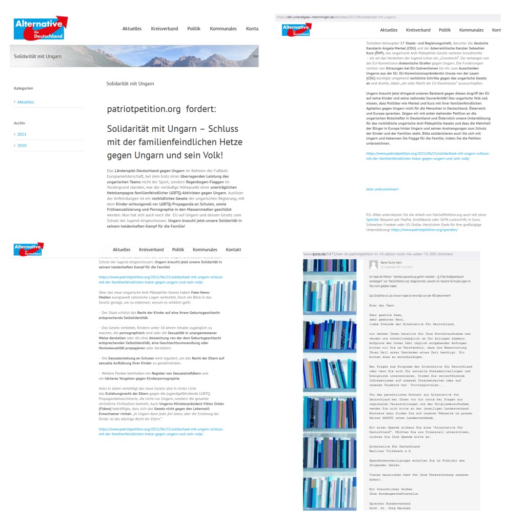 AfD bewirbt selbst, wie gelesen werden kann, Petitionen von „patriotpetition“, wie diese: „Solidarität mit Ungarn – Schluss mit familienfeindlicher Hetze gegen Ungarn und sein Volk!“. AfD fordert auf: „Jetzt unterzeichnen“ … Und etwas darf so recht gar nicht fehlen, Afd bittet um Spenden: